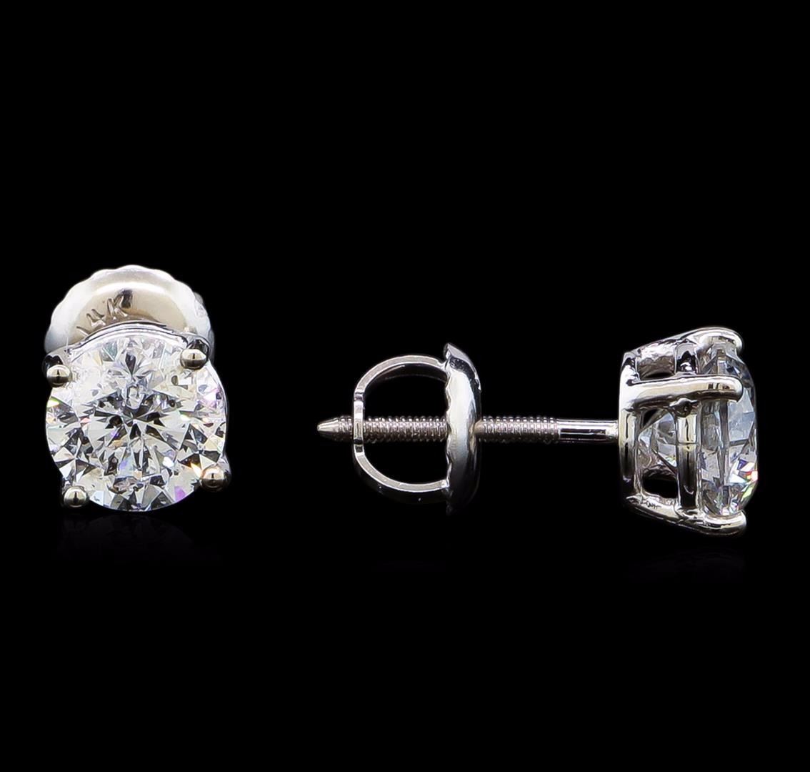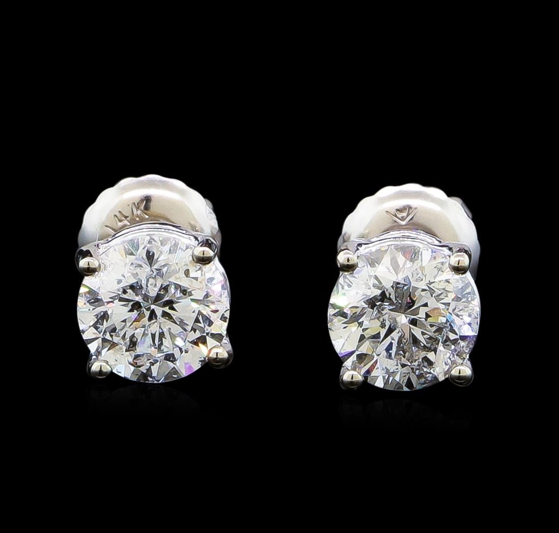 One pair electronically tested 14KT white gold lady's combination cast & assembled diamond stud earrings with threaded posts and screw-on/screw-off backs with a basket setting with a bright polish finish. Identified with markings of "14K". Condition is new, good workmanship. Containing: One prong set round brilliant cut diamond, measuring 5.64 - 5.60 x 3.66mm (depth est.) approximate weight of 0.73ct. Graded in the setting. Clarity: SI-2. Color: G - Good One prong set round brilliant cut diamond, measuring 5.59 - 5.57 x 3.64mm (depth est.) , 3.00.%. GTCF approximate weight of 0.72ct. Graded in the setting. Clarity: SI-2. Color: G - Good. Total Weight of Diamonds 1.45ct. Total Weight of Stud Earrings 1.20gm. GAS Appraised at $11,080.00.