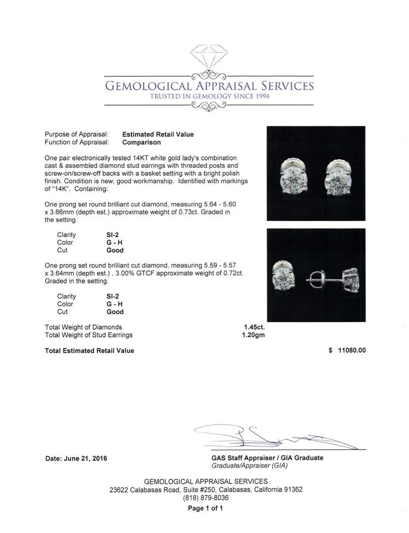 One pair electronically tested 14KT white gold lady's combination cast & assembled diamond stud earrings with threaded posts and screw-on/screw-off backs with a basket setting with a bright polish finish. Identified with markings of "14K". Condition is new, good workmanship. Containing: One prong set round brilliant cut diamond, measuring 5.64 - 5.60 x 3.66mm (depth est.) approximate weight of 0.73ct. Graded in the setting. Clarity: SI-2. Color: G - Good One prong set round brilliant cut diamond, measuring 5.59 - 5.57 x 3.64mm (depth est.) , 3.00.%. GTCF approximate weight of 0.72ct. Graded in the setting. Clarity: SI-2. Color: G - Good. Total Weight of Diamonds 1.45ct. Total Weight of Stud Earrings 1.20gm. GAS Appraised at $11,080.00.