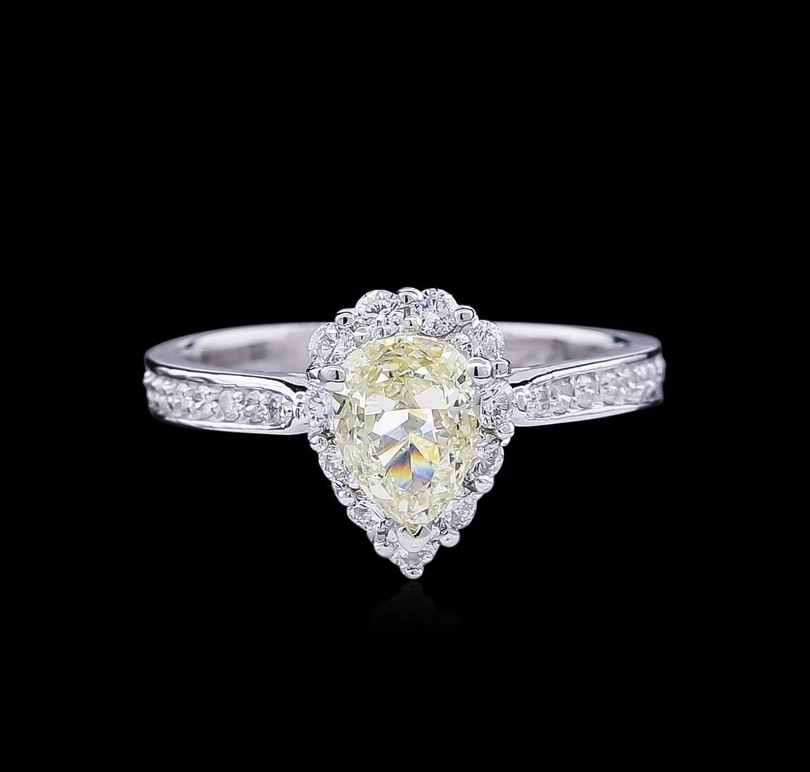 One electronically tested 14KT white gold lady's cast wedding ring with a basket halo with a bright polish finish. The featured lady's ring has a shank measuring 2.13 millimeters wide. Identified with markings of "14K". Condition is new, good workmanship. Containing: One prong set pear shaped cut diamond, measuring 7.32 x 5.54 x 3.29mm (depth est.) , 15.00.%. GTCF approximate weight of 1.02ct. Graded in the setting. Clarity: VS-1 Cut Very Good Eleven prong set round brilliant cut diamonds, measuring 1.90 - 1.85 x 1.17mm (depth est.) approximate total weight of 11 Stones = 0.28ct. Graded in the setting. Clarity: SI-1 to SI-2. Color: G - Good Sixteen prong set round brilliant cut diamonds, measuring 1.40 - 1.30 x 0.84mm (depth est.) approximate total weight of 16 Stones = 0.15ct. Graded in the setting. Clarity: SI-1 to I-1. Color: G - Good. Total Weight of Diamonds 1.45ct. Total Weight of Ring 2.40gm. GAS Appraised at $10,505.00.