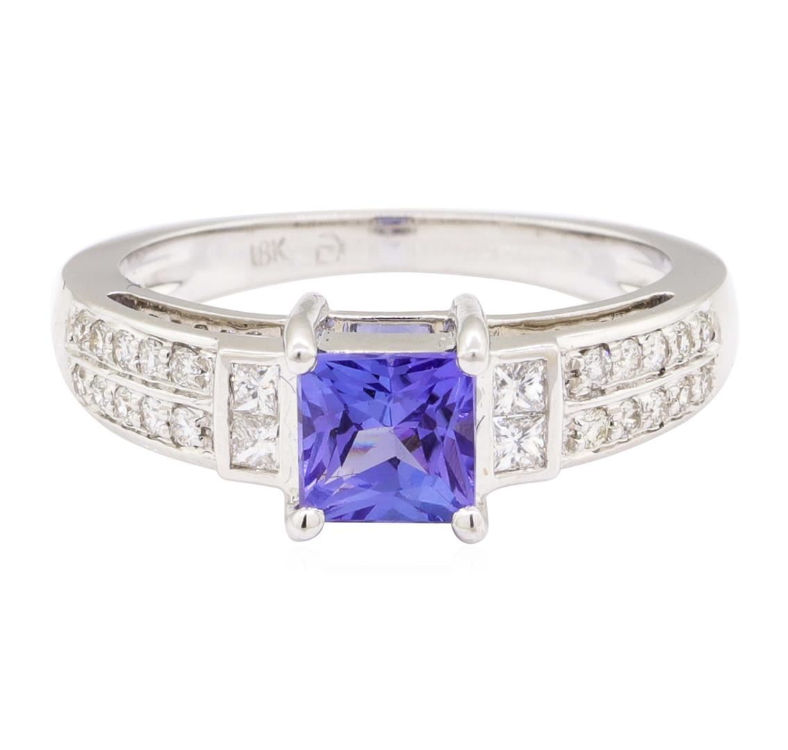 One electronically tested 18KT white gold lady's cast fashion ring with a cathedral shank with a bright polish finish. The featured lady's ring has a shank measuring 2.00 millimeters wide. Identified with markings of '18K'. Condition is new, good workmanship. Containing: One prong set princess modified brilliant cut natural tanzanite, measuring 5.53 x 5.49 x 4.15mm, (depth est.) approximate weight of 1.12ct., clarity is eye clean, medium, moderately strong, violetish blue color, (GIA vB 5/4), cut is very good. Transmitting light with no distortion, transparent. Colored gemstones are presumed to have been subjected to commonly used enhancement processes. Graded in the setting. Four channel set princess cut diamonds, measuring 1.80 x 1.70 x 1.28mm (depth est.) approximate total weight of 4 Stones = 0.13ct. Graded in the setting. Color H - I Clarity VS-2 to SI-1 Cut Very Good Twenty prong set round brilliant cut diamonds, measuring 1.40 - 1.35 x 0.86mm (depth est.) approximate total weight of 20 Stones = 0.20ct. Graded in the setting. Color G - H Clarity SI-1 to SI-2 Cut Good. Total Weight of Colored Stones 1.12ct.. Total Weight of Diamonds 0.33ct.. Total Weight of Ring 5.20gm GAS Appraised at $3245.00. GAS Appraised.