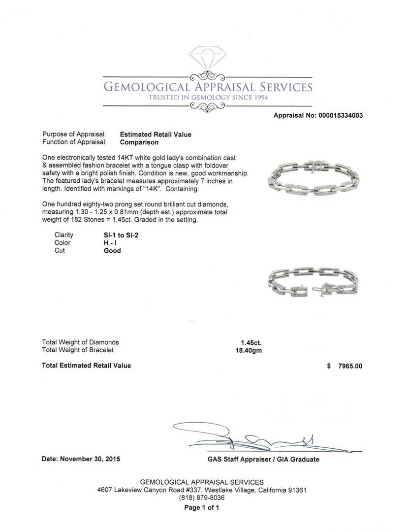 One electronically tested 14KT white gold lady's combination cast & assembled fashion bracelet with a tongue clasp with foldover safety with a bright polish finish. The featured lady's bracelet measures approximately 7 inches in length. Identified with markings of "14K". Condition is new, good workmanship. Containing: One Hundred Eighty-Two prong set round brilliant cut diamonds, measuring 1.30 - 1.25 x 0.81mm (depth est.) approximate total weight of 182 Stones = 1.45ct. Graded in the setting. Clarity: SI-1 to SI-2 . Color: H - I. Cut Good. Total Weight of Diamonds 1.45ct.. Total Weight of Bracelet 18.40gm at $ 7965.00 GAS Appraised.