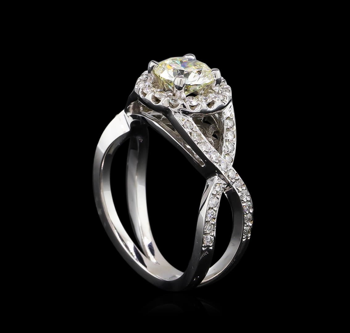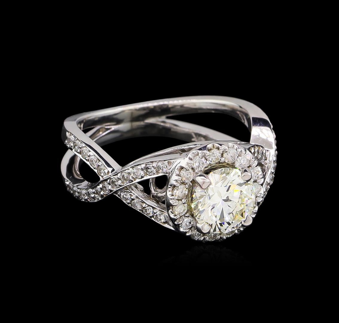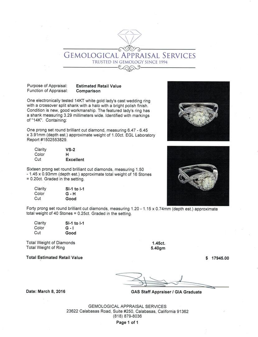 One electronically tested 14KT white gold lady's cast wedding ring with a crossover split shank with a halo with a bright polish finish. The featured lady's ring has a shank measuring 3.29 millimeters wide. Identified with markings of "14K". Condition is new, good workmanship. Containing: One prong set round brilliant cut diamond, measuring 6.47 - 6.45 x 3.91mm (depth est.) approximate weight of 1.00ct. EGL Laboratory Report #1502553829. Clarity: VS-2. Color: Excellent Sixteen prong set round brilliant cut diamonds, measuring 1.50 - 1.45 x 0.93mm (depth est.) approximate total weight of 16 Stones = 0.20ct. Graded in the setting. Clarity: SI-1 to I-1. Color: G - Good Forty prong set round brilliant cut diamonds, measuring 1.20 - 1.15 x 0.74mm (depth est.) approximate total weight of 40 Stones = 0.25ct. Graded in the setting. Clarity: SI-1 to I-1. Color: G - I. Cut Good. Total Weight of Diamonds 1.45ct. Total Weight of Ring 5.40gm. GAS Appraised at $17,945.00.
