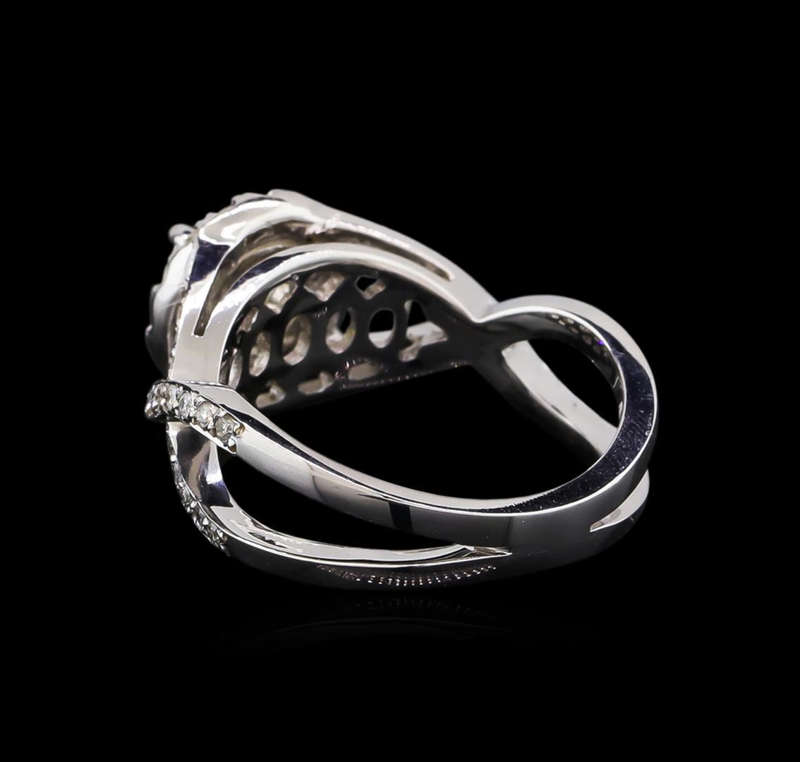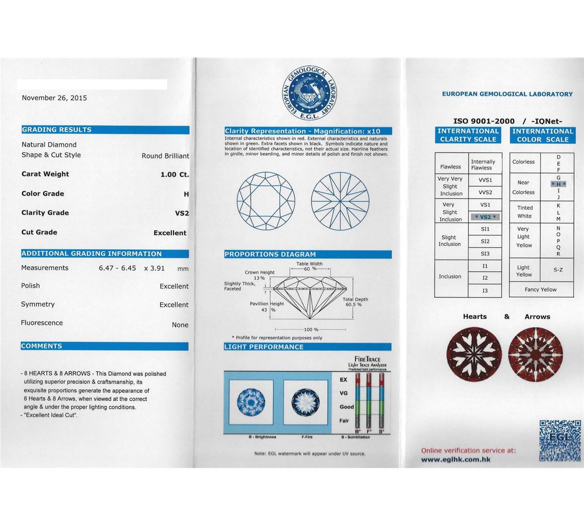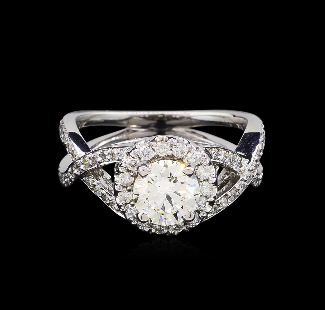 One electronically tested 14KT white gold lady's cast wedding ring with a crossover split shank with a halo with a bright polish finish. The featured lady's ring has a shank measuring 3.29 millimeters wide. Identified with markings of "14K". Condition is new, good workmanship. Containing: One prong set round brilliant cut diamond, measuring 6.47 - 6.45 x 3.91mm (depth est.) approximate weight of 1.00ct. EGL Laboratory Report #1502553829. Clarity: VS-2. Color: Excellent Sixteen prong set round brilliant cut diamonds, measuring 1.50 - 1.45 x 0.93mm (depth est.) approximate total weight of 16 Stones = 0.20ct. Graded in the setting. Clarity: SI-1 to I-1. Color: G - Good Forty prong set round brilliant cut diamonds, measuring 1.20 - 1.15 x 0.74mm (depth est.) approximate total weight of 40 Stones = 0.25ct. Graded in the setting. Clarity: SI-1 to I-1. Color: G - I. Cut Good. Total Weight of Diamonds 1.45ct. Total Weight of Ring 5.40gm. GAS Appraised at $17,945.00.