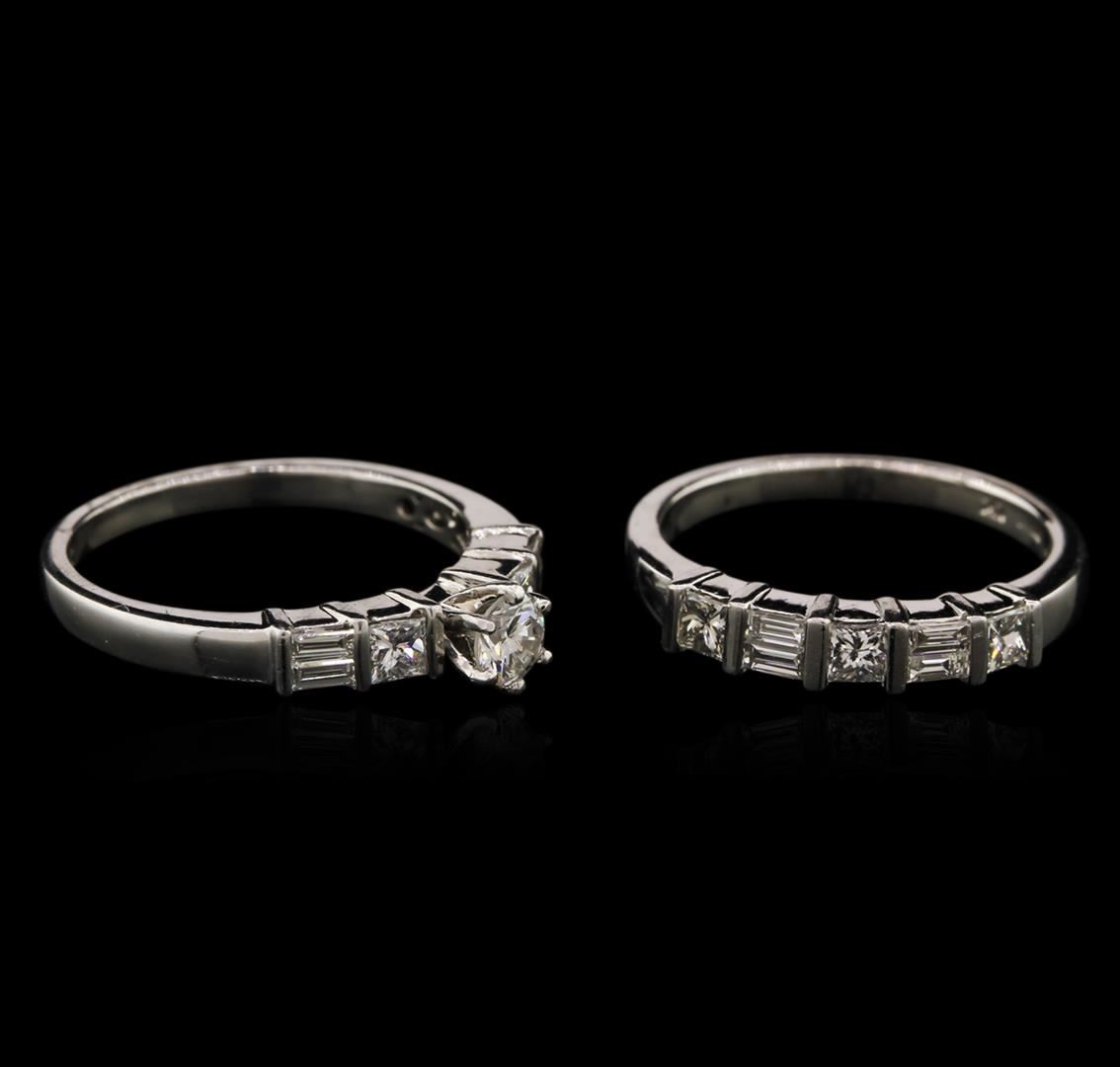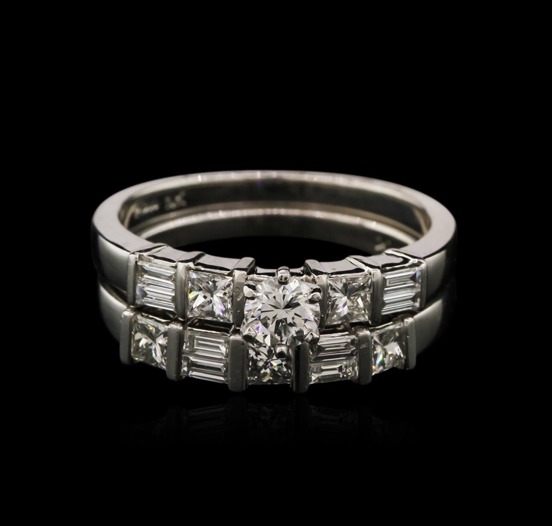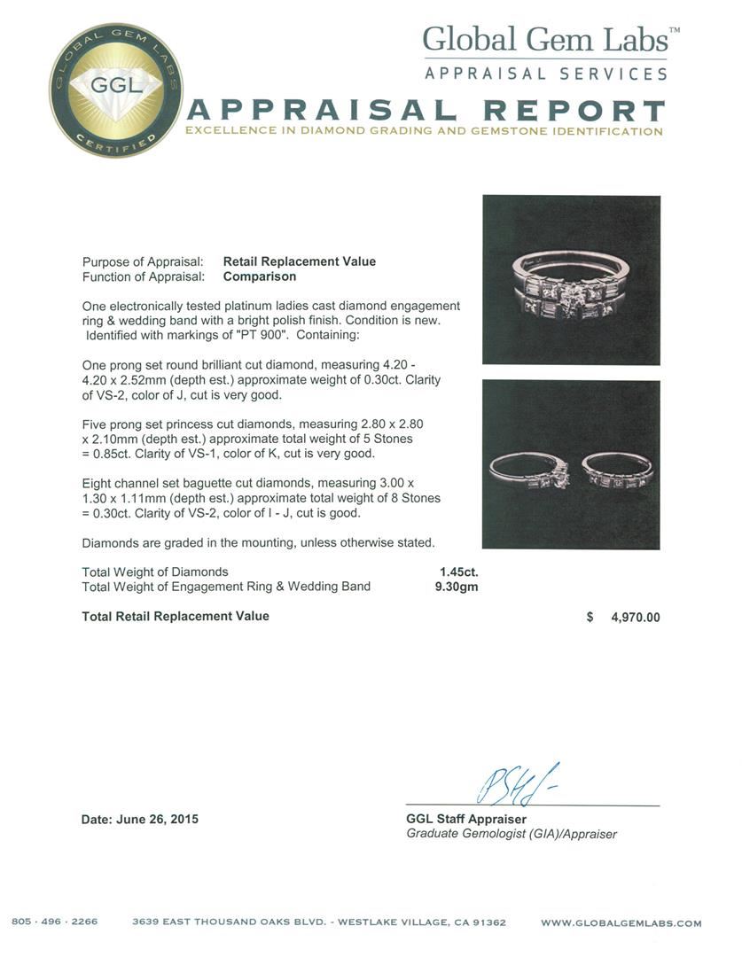 One electronically tested platinum ladies cast diamond engagement ring & wedding band with a bright polish finish. Identified with markings of "PT 900". Condition is new. Containing: One prong set round brilliant cut diamond, measuring 4.20 - 4.20 x 2.52mm (depth est.) approximate weight of 0.30ct. Clarity: VS-2. Color: J, Cut is Very Good. Five prong set princess cut diamonds, measuring 2.80 x 2.80 x 2.10mm (depth est.) approximate total weight of 5 Stones = 0.85ct. Clarity: VS-1. Color: K, Cut is Very Good. Eight channel set baguette cut diamonds, measuring 3.00 x 1.30 x 1.11mm (depth est.) approximate total weight of 8 Stones = 0.30ct. Clarity: VS-2. Color: I - J, Cut is Good. Diamonds are graded in the mounting, unless otherwise stated. Total Weight of Diamonds 1.45ct. Total Weight of Engagement Ring & Wedding Band 9.30 grams. GGL Appraised at $4,970.00.