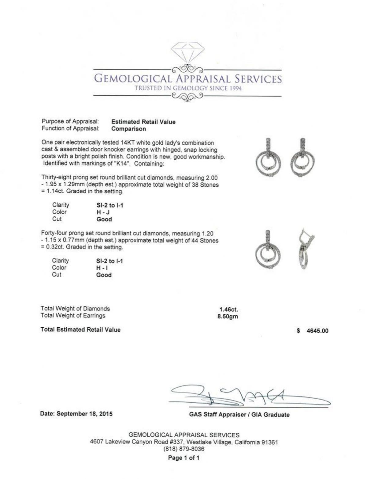 One pair electronically tested 14KT white gold lady's combination cast & assembled door knocker earrings with hinged, snap locking posts with a bright polish finish. Identified with markings of "K14". Condition is new, good workmanship. Containing: Thirty-Eight prong set round brilliant cut diamonds, measuring 2.00 - 1.95 x 1.29mm (depth est.) approximate total weight of 38 Stones = 1.14ct. Graded in the setting. Clarity: SI-2 to I-1. Color: H - Good Forty-Four prong set round brilliant cut diamonds, measuring 1.20 - 1.15 x 0.77mm (depth est.) approximate total weight of 44 Stones = 0.32ct. Graded in the setting. Clarity: SI-2 to I-1. Color: H - I. Cut Good. Total Weight of Diamonds 1.46ct. Total Weight of Earrings 8.50gm. GAS Appraised.