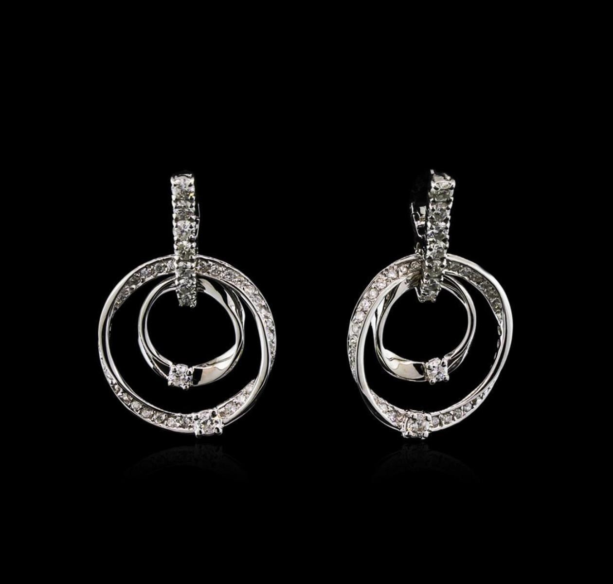 One pair electronically tested 14KT white gold lady's combination cast & assembled door knocker earrings with hinged, snap locking posts with a bright polish finish. Identified with markings of "K14". Condition is new, good workmanship. Containing: Thirty-Eight prong set round brilliant cut diamonds, measuring 2.00 - 1.95 x 1.29mm (depth est.) approximate total weight of 38 Stones = 1.14ct. Graded in the setting. Clarity: SI-2 to I-1. Color: H - Good Forty-Four prong set round brilliant cut diamonds, measuring 1.20 - 1.15 x 0.77mm (depth est.) approximate total weight of 44 Stones = 0.32ct. Graded in the setting. Clarity: SI-2 to I-1. Color: H - I. Cut Good. Total Weight of Diamonds 1.46ct. Total Weight of Earrings 8.50gm. GAS Appraised.