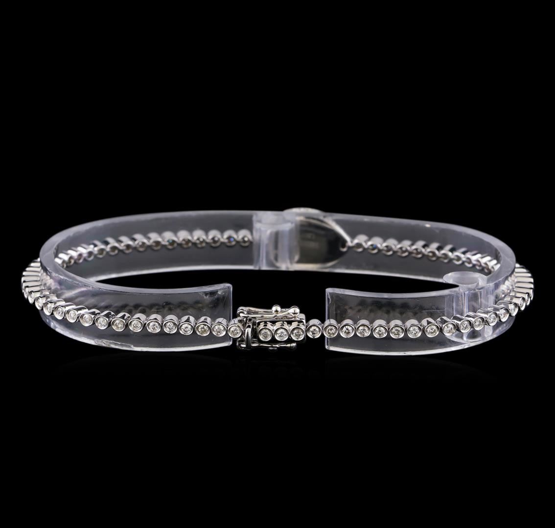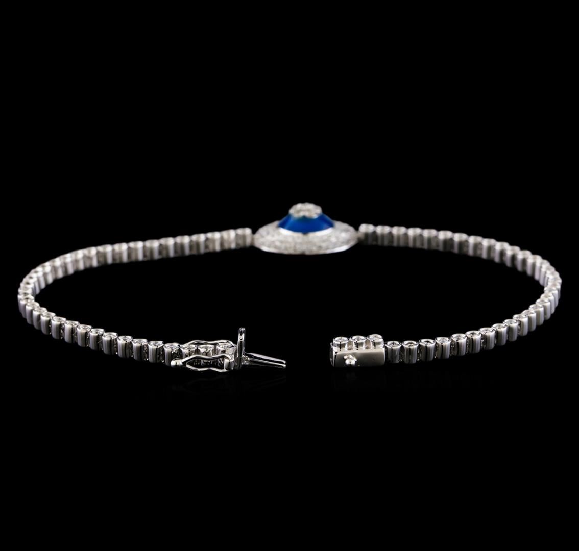 One electronically tested 14KT white gold ladies cast & assembled diamond bracelet. Seven and one-half inch length bracelet features a blue enamel and diamond encrusted "evil eye" center supported by a flexible diamond ribbon, terminating in a concealed clasp with twin safeties. Bright polish finish. Indenting with markings of "14KT 585".The "evil eye" is thought to be a good luck charm by reflecting evil. It is believed to guard against misfortune by keeping one's life in balance. Condition is new, good workmanship. Containing: Seventy-Nine prong & bezel set round brilliant cut diamonds, measuring 1.70 - 1.50 x 0.96mm (depth est.) approximate total weight of 79 Stones = 1.18ct. Graded in the setting. Clarity: I-1 to I-2. Color: F - H Fifty-Eight prong set round brilliant cut diamonds, measuring 1.20 - 1.00 x 0.66mm (depth est.) approximate total weight of 58 Stones = 0.28ct. Graded in the setting. Clarity: I-1 to I-2. Color: F - H. Total Weight of Diamonds 1.46ct. Total Weight of Bracelet 10.01gm. AIG Appraised at $5,620.00.