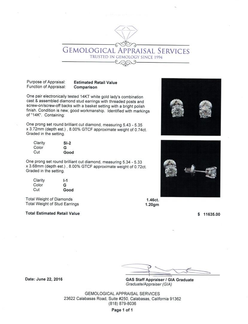 One pair electronically tested 14KT white gold lady's combination cast & assembled diamond stud earrings with threaded posts and screw-on/screw-off backs with a basket setting with a bright polish finish. Identified with markings of "14K". Condition is new, good workmanship. Containing: One prong set round brilliant cut diamond, measuring 5.43 - 5.35 x 3.72mm (depth est.) , 8.00.%. GTCF approximate weight of 0.74ct. Graded in the setting. Clarity: SI-2. Color: Good One prong set round brilliant cut diamond, measuring 5.34 - 5.33 x 3.68mm (depth est.) , 8.00.%. GTCF approximate weight of 0.72ct. Graded in the setting. Clarity: I-1. Color: Good. Total Weight of Diamonds 1.46ct. Total Weight of Stud Earrings 1.20gm. GAS Appraised at $11,635.00.
