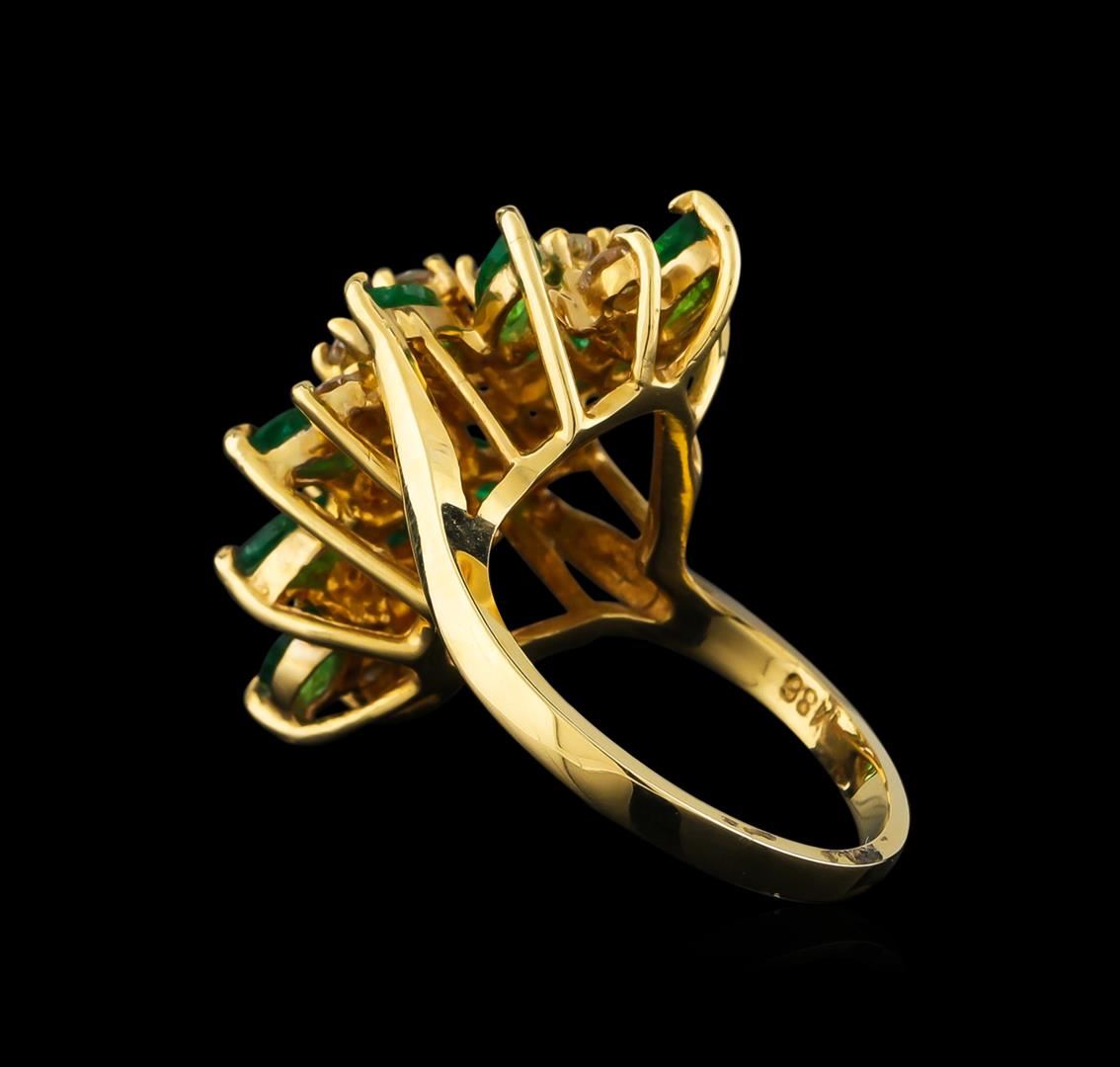 One electronically tested 14KT yellow gold lady's cast fashion ring with a basket halo with a bright polish finish. The featured lady's ring has a shank measuring 2.04 millimeters wide. Identified with markings of "14K". Condition is new, good workmanship. Containing: Ten prong set marquise modified brilliant cut natural emeralds, measuring 5.20 x 2.80 x 1.83mm, approximate total weight of 1.46ct., clarity is moderately included, type III, medium light, very slightly grayish, green color, (GIA G 4/3), cut is good. Transmitting light somewhat diffusely, transparent to translucent. Naturally occurring internal & external characteristics are present. Indications of oil residue. Graded in the setting. Twelve prong set round brilliant cut diamonds, measuring 2.55 - 2.45 x 1.55mm (depth est.) approximate total weight of 12 Stones = 0.72ct. Graded in the setting. Clarity: VS-2 to SI-2. Color: G - Good. Total Weight of Colored Stones 1.46ct. Total Weight of Diamonds 0.72ct. Total Weight of Ring 6.30gm. GAS Appraised at $3,115.00.