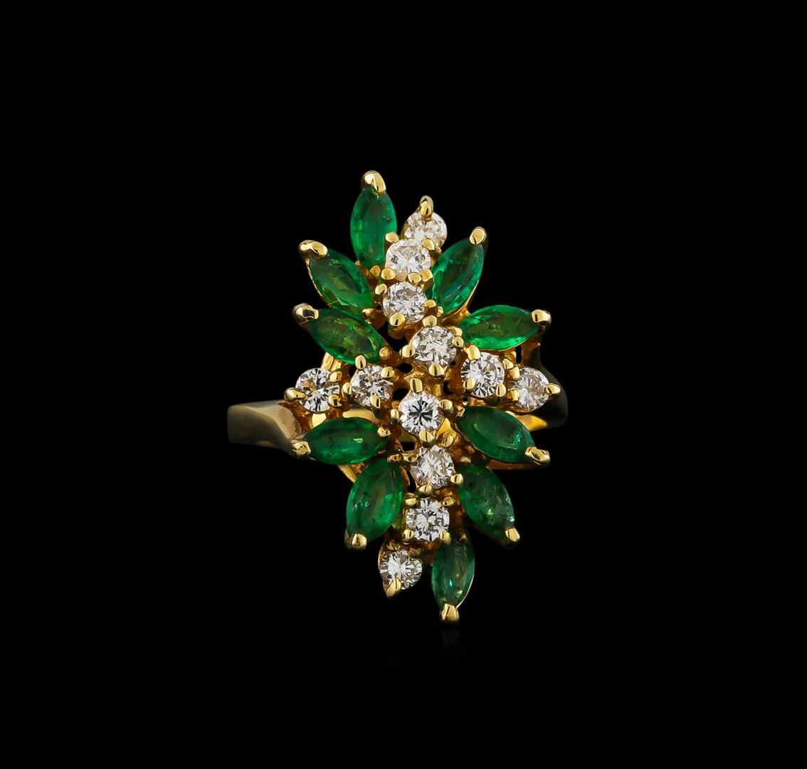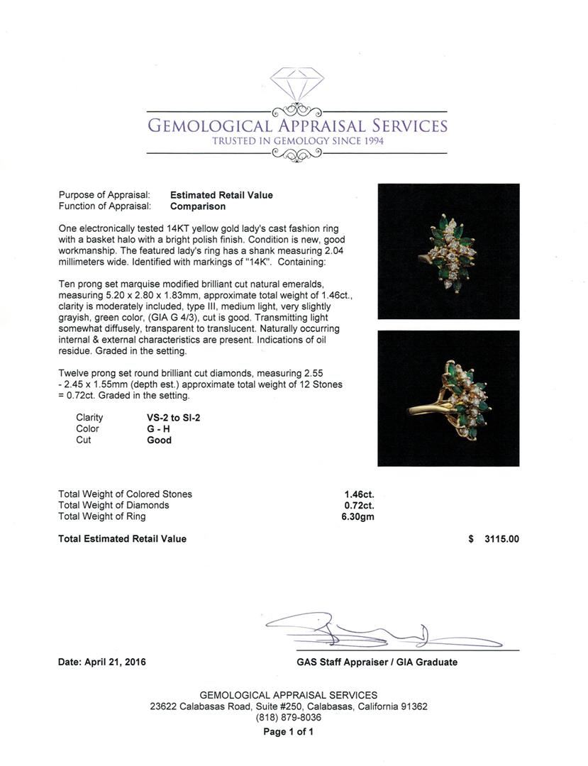 One electronically tested 14KT yellow gold lady's cast fashion ring with a basket halo with a bright polish finish. The featured lady's ring has a shank measuring 2.04 millimeters wide. Identified with markings of "14K". Condition is new, good workmanship. Containing: Ten prong set marquise modified brilliant cut natural emeralds, measuring 5.20 x 2.80 x 1.83mm, approximate total weight of 1.46ct., clarity is moderately included, type III, medium light, very slightly grayish, green color, (GIA G 4/3), cut is good. Transmitting light somewhat diffusely, transparent to translucent. Naturally occurring internal & external characteristics are present. Indications of oil residue. Graded in the setting. Twelve prong set round brilliant cut diamonds, measuring 2.55 - 2.45 x 1.55mm (depth est.) approximate total weight of 12 Stones = 0.72ct. Graded in the setting. Clarity: VS-2 to SI-2. Color: G - Good. Total Weight of Colored Stones 1.46ct. Total Weight of Diamonds 0.72ct. Total Weight of Ring 6.30gm. GAS Appraised at $3,115.00.