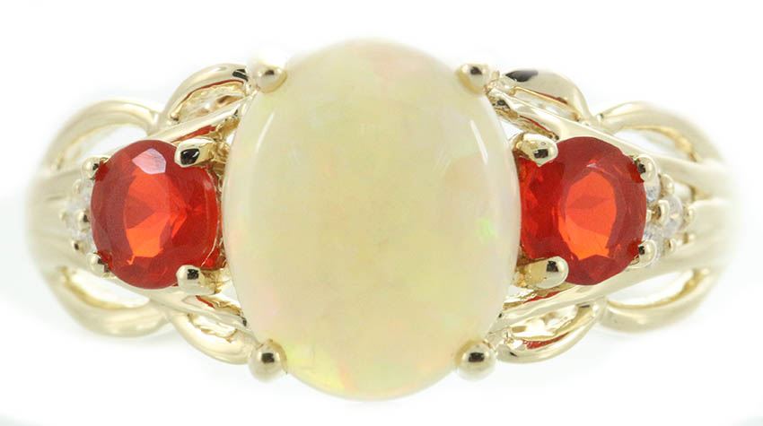 One Australian Opal, Fire Opal, and Diamond Ring featuring: 14KT Yellow Gold with a total weight of 2.42 grams, Australian Opal with a total weight of 1.46ct, Two Fire Opal Stones with a total weight of 0.36ctw, and Six Diamonds with a total weight of 0.05ctw.