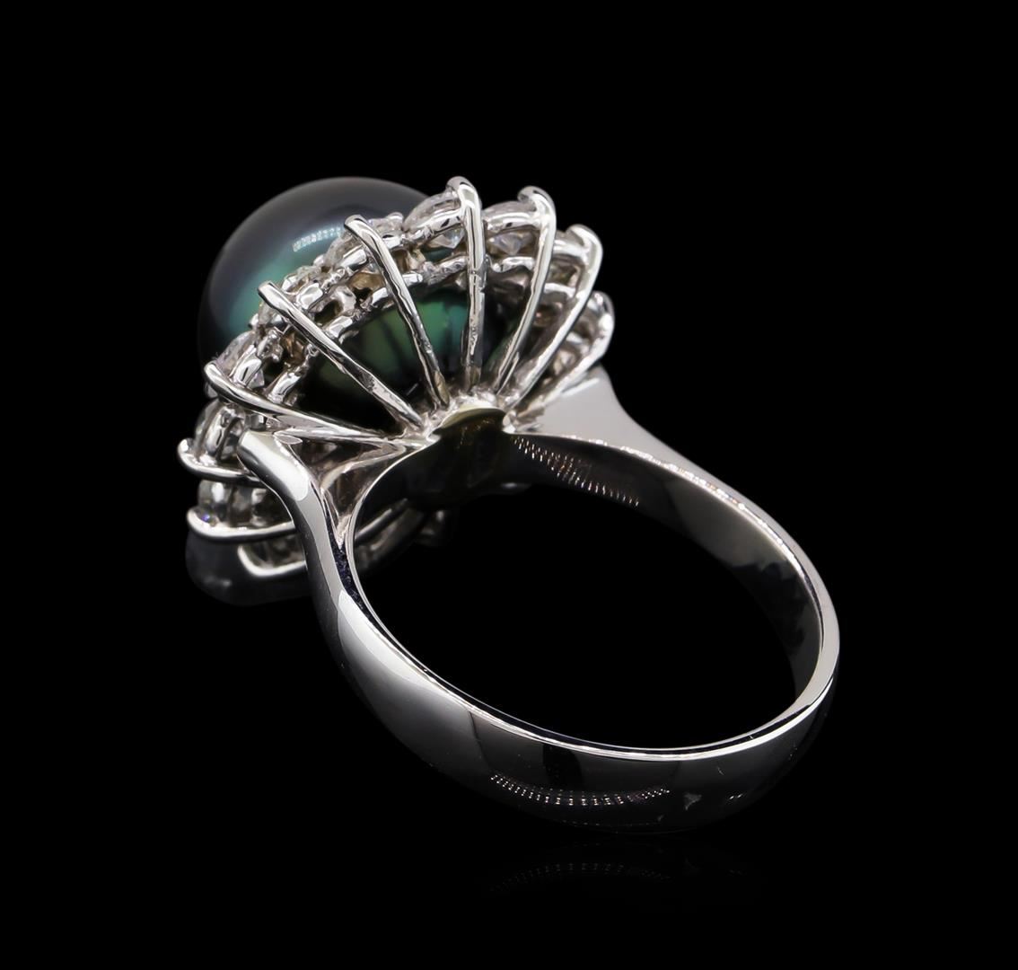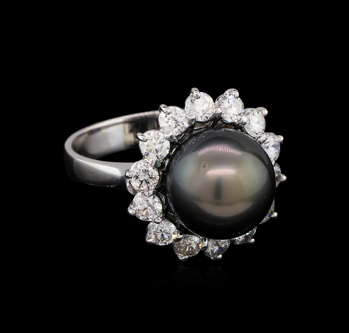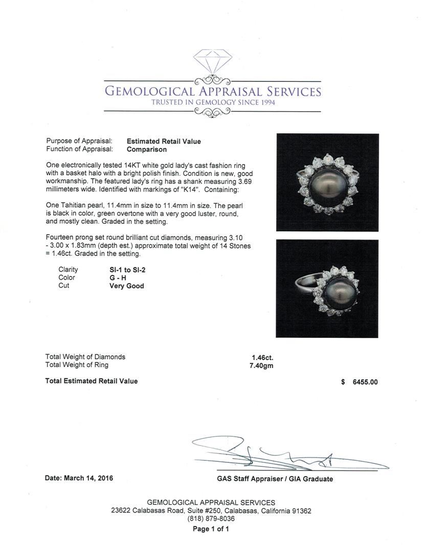 One electronically tested 14KT white gold lady's cast fashion ring with a basket halo with a bright polish finish. The featured lady's ring has a shank measuring 3.69 millimeters wide. Identified with markings of "K14". Condition is new, good workmanship. Containing: One Tahitian pearl, 11.4mm in size to 11.4mm in size. The pearl is black in color, green overtone with a very good luster, round, and mostly clean. Graded in the setting. Fourteen prong set round brilliant cut diamonds, measuring 3.10 - 3.00 x 1.83mm (depth est.) approximate total weight of 14 Stones = 1.46ct. Graded in the setting. Clarity: SI-1 to SI-2. Color: G - Very Good. Total Weight of Diamonds 1.46ct. Total Weight of Ring 7.40gm. GAS Appraised at $6,455.00.