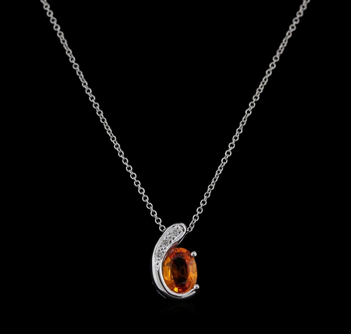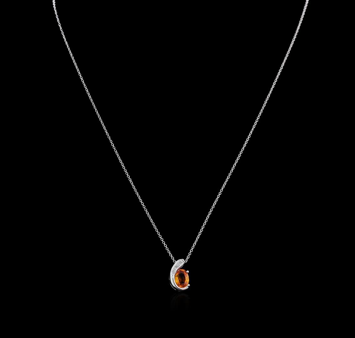 One pendant with chain featuring: 18KT white gold weighing 1.74 grams containing one prong set oval cut yellow sapphire center stone with a total weight of 1.46ct and three pave set round diamonds with a total weight of 0.05ct.