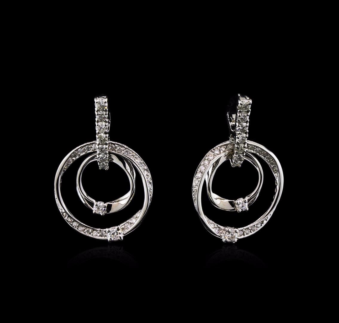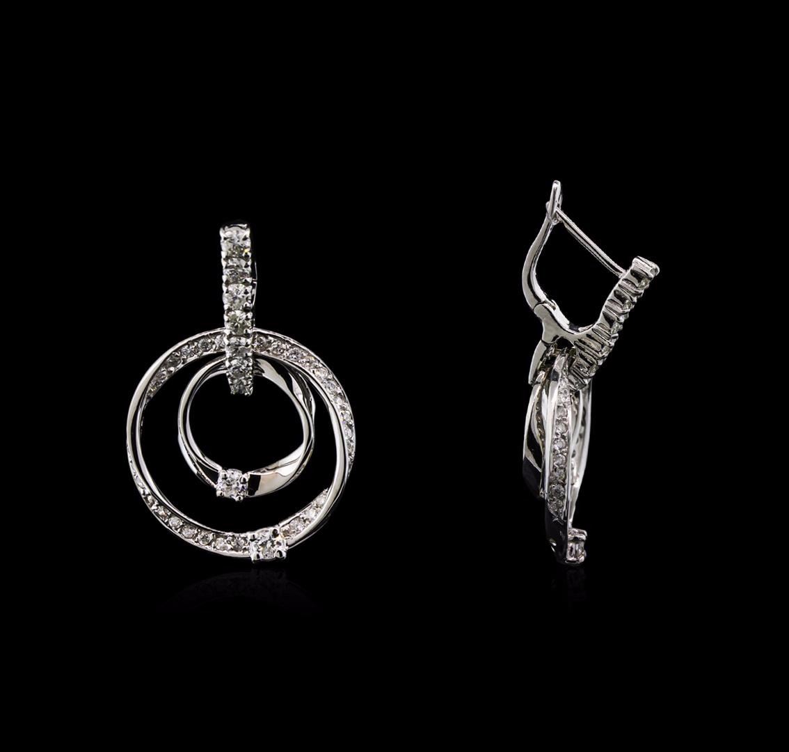 One pair electronically tested 14KT white gold lady's combination cast & assembled door knocker earrings with hinged, snap locking posts with a bright polish finish. Identified with markings of "K14". Condition is new, good workmanship. Containing: Thirty-Eight prong set round brilliant cut diamonds, measuring 2.00 - 1.95 x 1.29mm (depth est.) approximate total weight of 38 Stones = 1.14ct. Graded in the setting. Clarity: SI-2 to I-1. Color: H - Good Forty-Four prong set round brilliant cut diamonds, measuring 1.20 - 1.15 x 0.77mm (depth est.) approximate total weight of 44 Stones = 0.32ct. Graded in the setting. Clarity: SI-2 to I-1. Color: H - I. Cut Good. Total Weight of Diamonds 1.46ct. Total Weight of Earrings 8.50gm. GAS Appraised at $4,645.00.