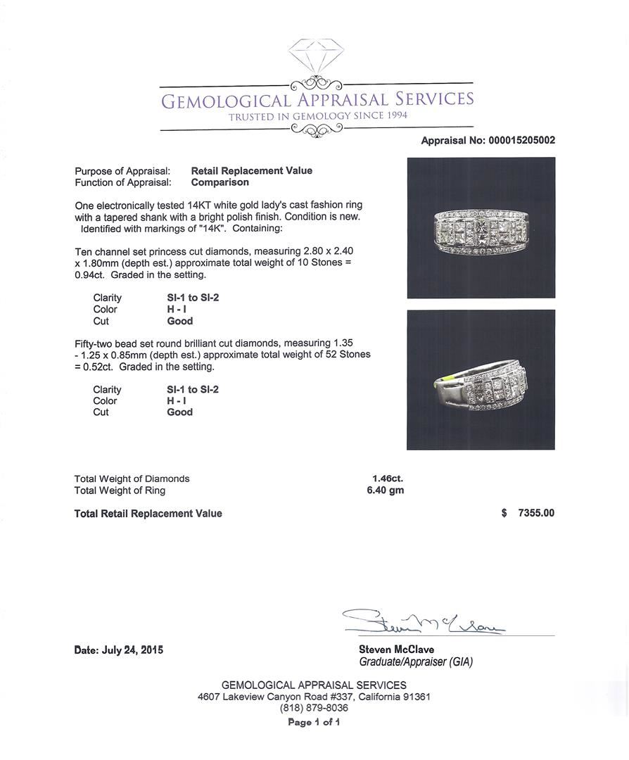 One electronically tested 14KT white gold lady's cast fashion ring with a tapered shank with a bright polish finish. Condition is new. Identified with markings of "14KT". Containing: Ten channel set princess cut diamonds, measuring 2.80 x 2.40 x 1.80mm (depth est.) approximate total weight of 10 Stones = 0.94ct. Graded in the setting. Clarity: SI-1 to SI-2. Color: H - I. Cut: Good. Total Weight of Diamonds: 1.46ct. Total Weight of Ring: 6.40 gm. GAS Appraised at $7,355.00.