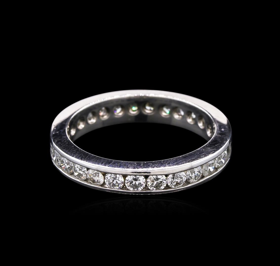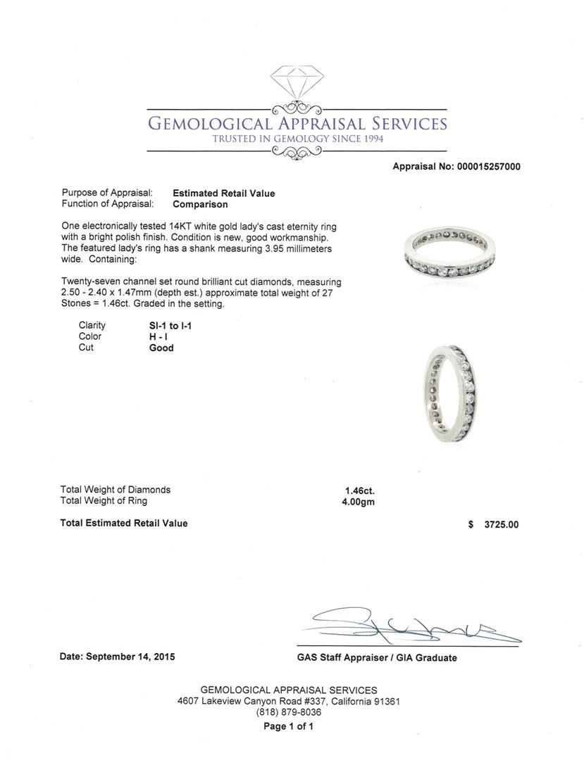 One electronically tested 14KT white gold lady's cast eternity ring with a bright polish finish. The featured lady's ring has a shank measuring 3.95 millimeters wide. Condition is new, good workmanship. Containing: Twenty-Seven channel set round brilliant cut diamonds, measuring 2.50 - 2.40 x 1.47mm (depth est.) approximate total weight of 27 Stones = 1.46ct. Graded in the setting. Clarity: SI-1 to I-1. Color: H - I. Cut Good. Total Weight of Diamonds 1.46ct. Total Weight of Ring 4.00gm. GAS Appraised at $3,725.00.