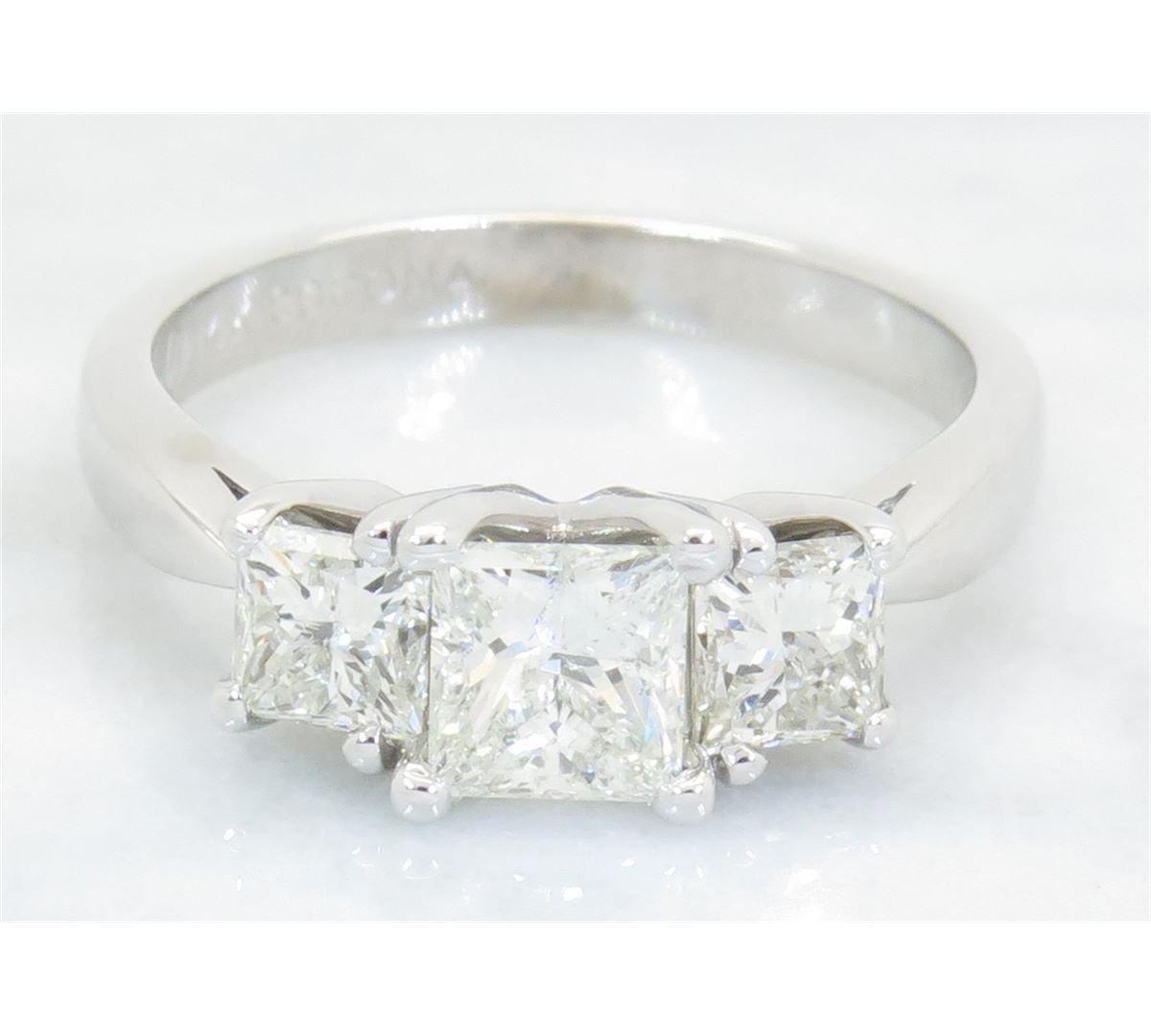One tested 14K white gold diamond ring. Containing: One Princess Cut Diamond. Approximate size: .70CT, Clarity: I1, Color: I-J. 2 Princess Cut Diamonds. Approximate total diamond weight: 1.46CTW. All diamonds are graded in the mounting unless otherwise stated. Weight of ring: 4.1 grams, Size: 5.75.