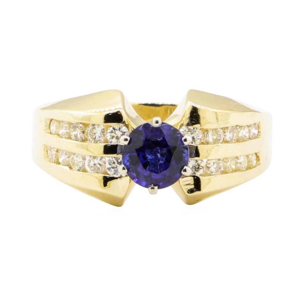 One electronically tested 14KT yellow gold lady's combination cast & assembled fashion ring with a cathedral tapered shoulders motif with a bright polish finish. The featured lady's ring has a shank measuring 3.70 millimeters wide. Identified with markings of '14K'. Condition is new, good workmanship. Containing: One prong set round modified mixed cut natural blue sapphire, measuring 5.63 - 5.53 x 3.63 mm, (depth est.) approximate weight of 0.91ct., clarity is eye clean, medium dark, strong, violetish blue color, (GIA vB 6/5), cut is good. Transmitting light with no distortion, transparent. Colored gemstones are presumed to have been subjected to commonly used enhancement processes. Graded in the setting. Twenty channel set round brilliant cut diamonds, measuring 2.00 - 1.90 x 1.21mm (depth est.) approximate total weight of 20 Stones = 0.56ct. Graded in the setting. Color H - I Clarity SI-1 to SI-2 Cut Good. Total Weight of Colored Stones 0.91ct.. Total Weight of Diamonds 0.56ct.. Total Weight of Ring 6.70gm GAS Appraised at $3395.00. GAS Appraised.