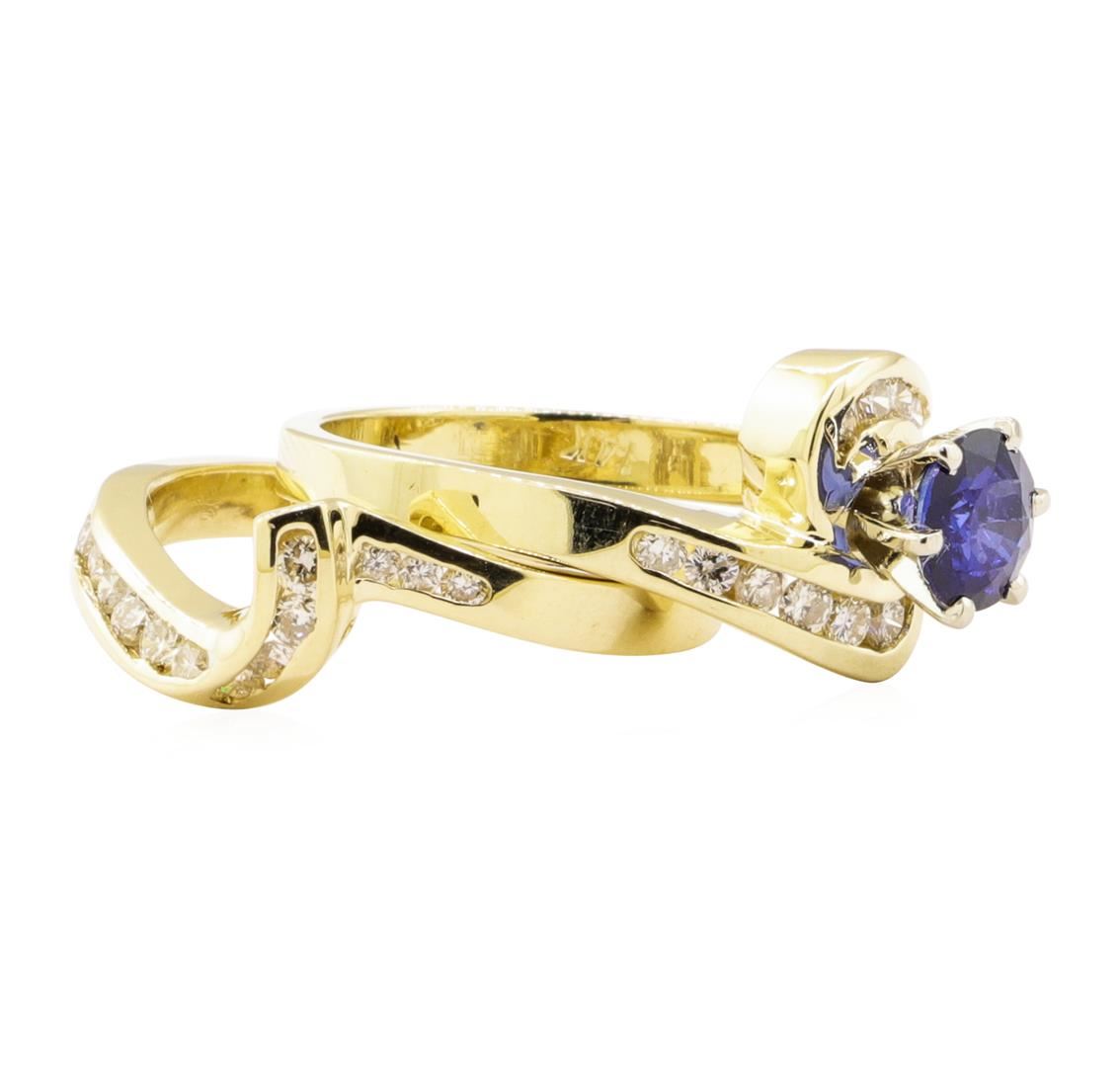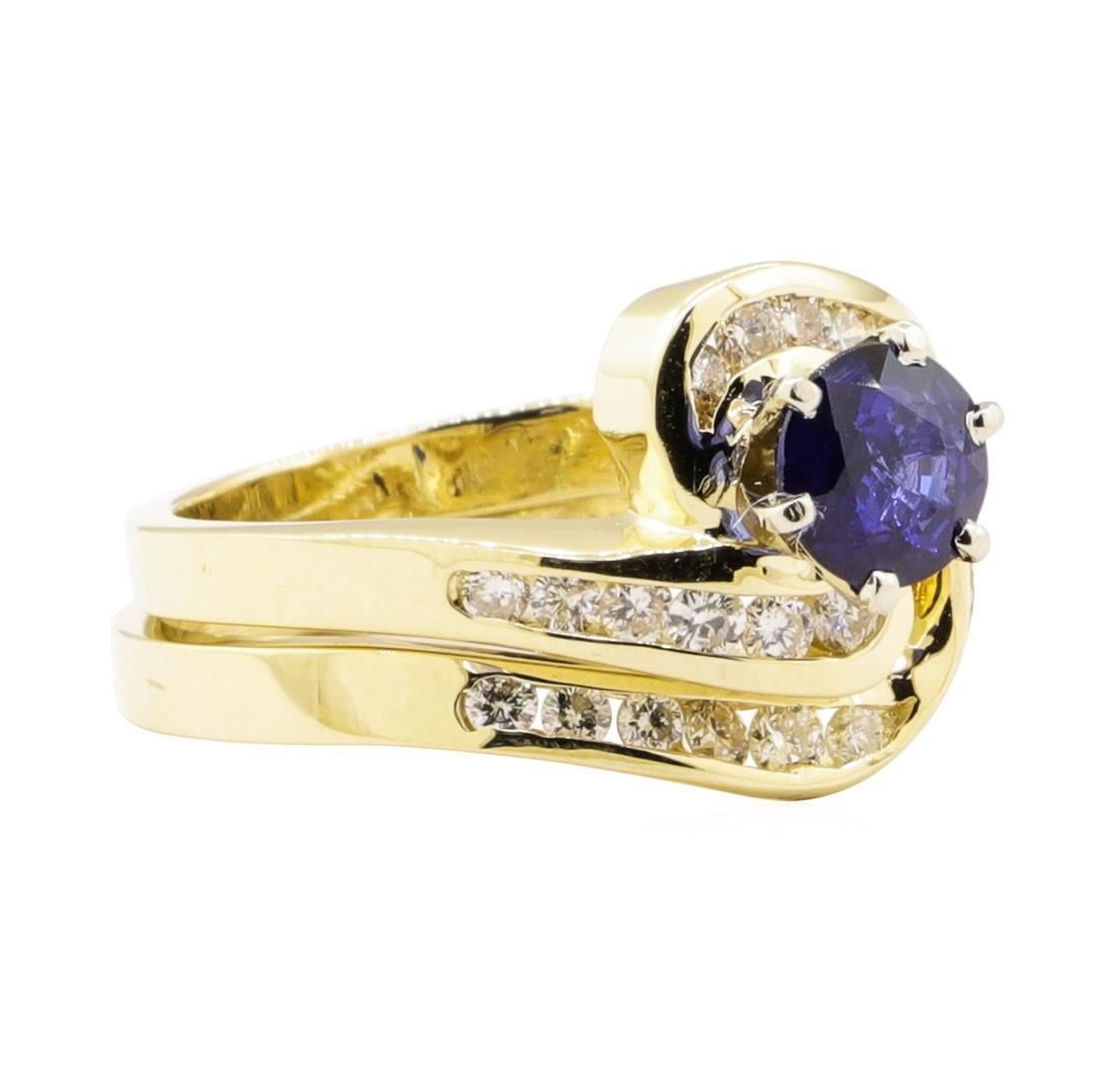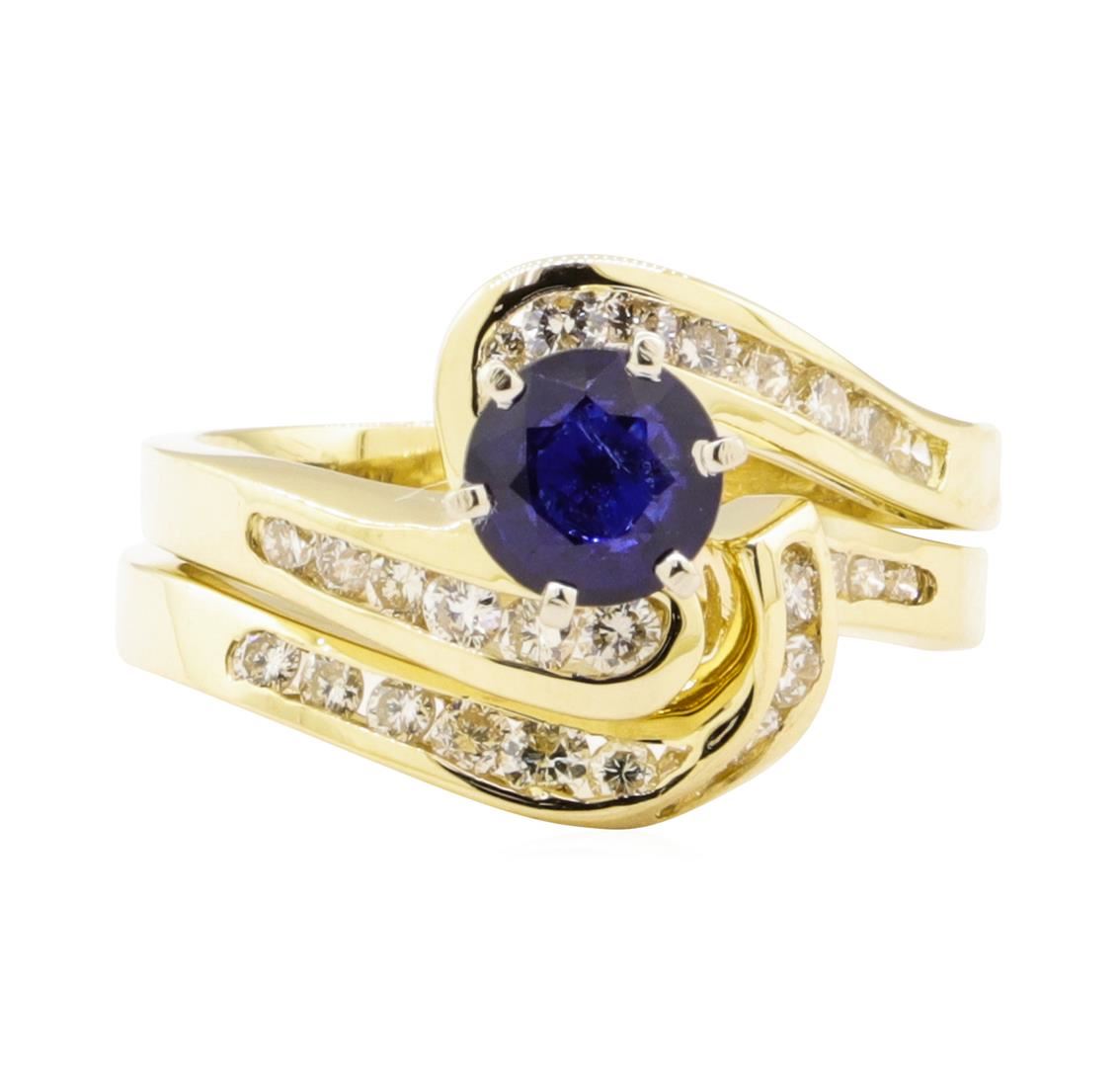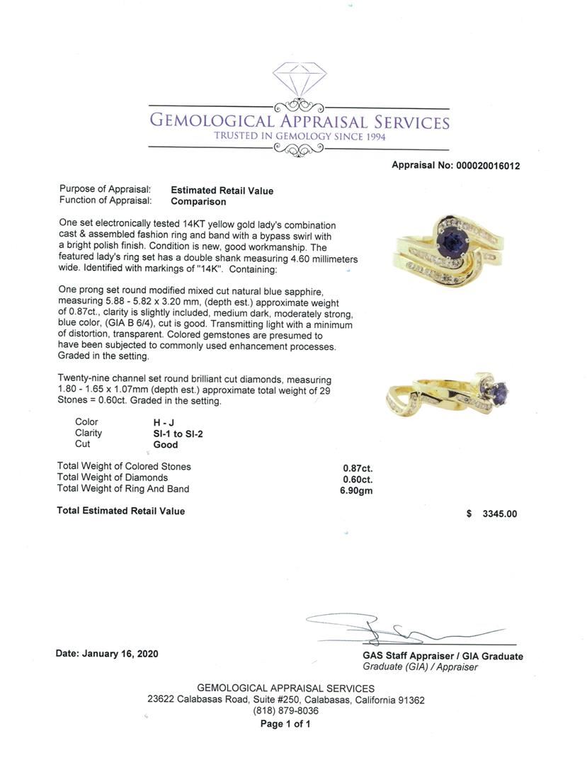 One set electronically tested 14KT yellow gold lady's combination cast & assembled fashion ring and band with a bypass swirl with a bright polish finish. The featured lady's ring set has a double shank measuring 4.60 millimeters wide. Identified with markings of '14K'. Condition is new, good workmanship. Containing: One prong set round modified mixed cut natural blue sapphire, measuring 5.88 - 5.82 x 3.20 mm, (depth est.) approximate weight of 0.87ct., clarity is slightly included, medium dark, moderately strong, blue color, (GIA B 6/4), cut is good. Transmitting light with a minimum of distortion, transparent. Colored gemstones are presumed to have been subjected to commonly used enhancement processes. Graded in the setting. Twenty-Nine channel set round brilliant cut diamonds, measuring 1.80 - 1.65 x 1.07mm (depth est.) approximate total weight of 29 Stones = 0.60 ct. Graded in the setting. Color H - J Clarity SI-1 to SI-2 Cut Good. Total Weight of Colored Stones 0.87ct.. Total Weight of Diamonds 0.60 ct.. Total Weight of Ring And Band 6.90gm GAS Appraised at $3345.00. GAS Appraised.