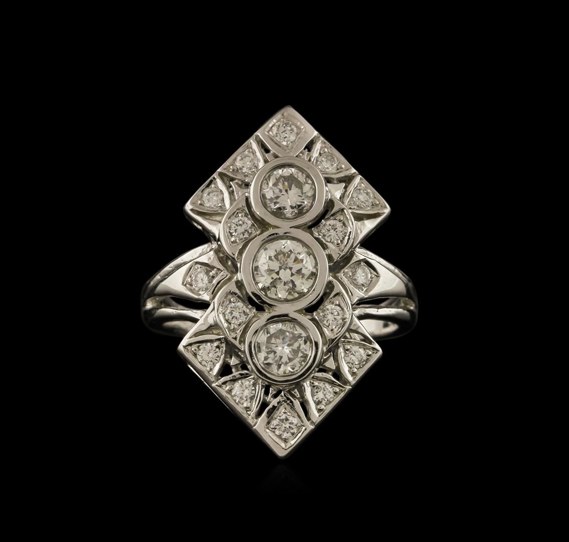 One electronically tested 14KT white gold ladies cast diamond ring with a bright polish finish. Identified with markings of "14". Condition is new. Containing: One bezel set round brilliant cut diamond, measuring 5.00 - 5.00 x 3.00mm (depth est.) approximate weight of 0.46ct. Clarity: I-1. Color: I, Cut is Good. Diamonds are graded in the mounting, unless otherwise stated. Two bezel set round brilliant cut diamonds, measuring 4.50 - 4.50 x 2.70mm (depth est.) approximate total weight of 2 Stones = 0.67ct. Clarity: SI-2 to I-1. Color: I - J, Cut is Good. Sixteen prong set round brilliant cut diamonds, measuring 1.80 - 1.80 x 1.08mm (depth est.) approximate total weight of 16 Stones = 0.34ct. Clarity: SI-1 to SI-2. Color: H - I, Cut is Good. Diamonds are graded in the mounting, unless otherwise stated. Total Weight of Diamonds 1.47ct. Total Weight of Ring 7.40 grams. GGL Appraised at $4,700.00.
