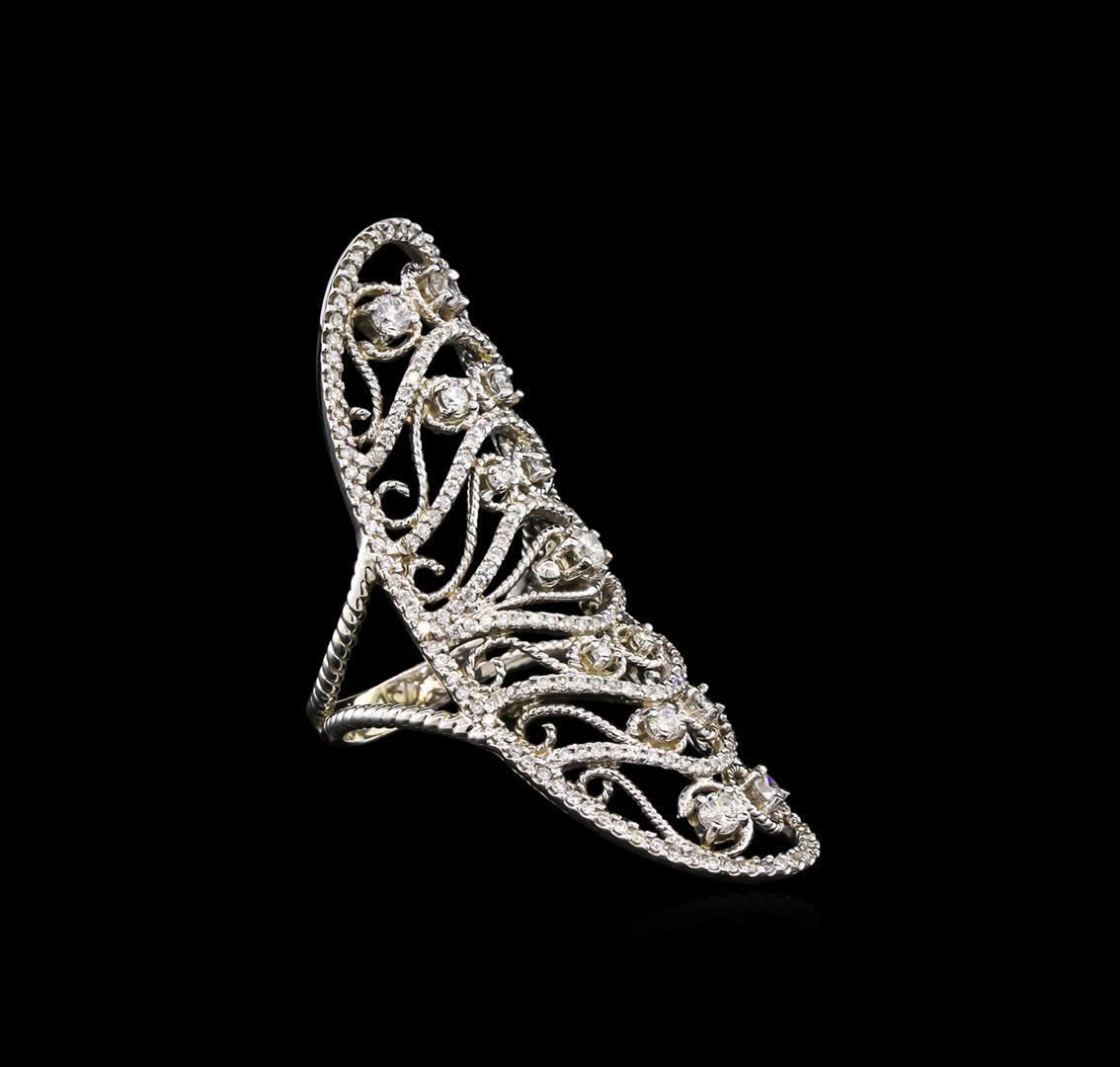 One electronically tested 14KT white gold lady's cast fashion ring with a split shank with a bright polish finish. The featured lady's ring has large oval filigree motif and a shank measuring 3.2 millimeters wide. Identified with markings of "K14". Condition is new, good workmanship. Containing: Five prong set round brilliant cut diamonds, measuring 3.00 - 2.90 x 1.92mm (depth est.) approximate total weight of 5 Stones = 0.51ct. Graded in the setting. Clarity: I-1. Color: I - Good Eight prong set round brilliant cut diamonds, measuring 2.00 - 1.80 x 1.24mm (depth est.) approximate total weight of 8 Stones = 0.22ct. Graded in the setting. Clarity: SI-2 to I-1. Color: H - I. Cut Good Two Hundred Twenty-Two prong set round brilliant cut diamonds, measuring 1.00 - 0.90 x 0.61mm (depth est.) approximate total weight of 222 Stones = 0.74ct. Graded in the setting. Clarity: SI-2 to I-1. Color: H - Good. Total Weight of Diamonds 1.47ct. Total Weight of Ring 9.20gm at $6545.00.. GAS Appraised.