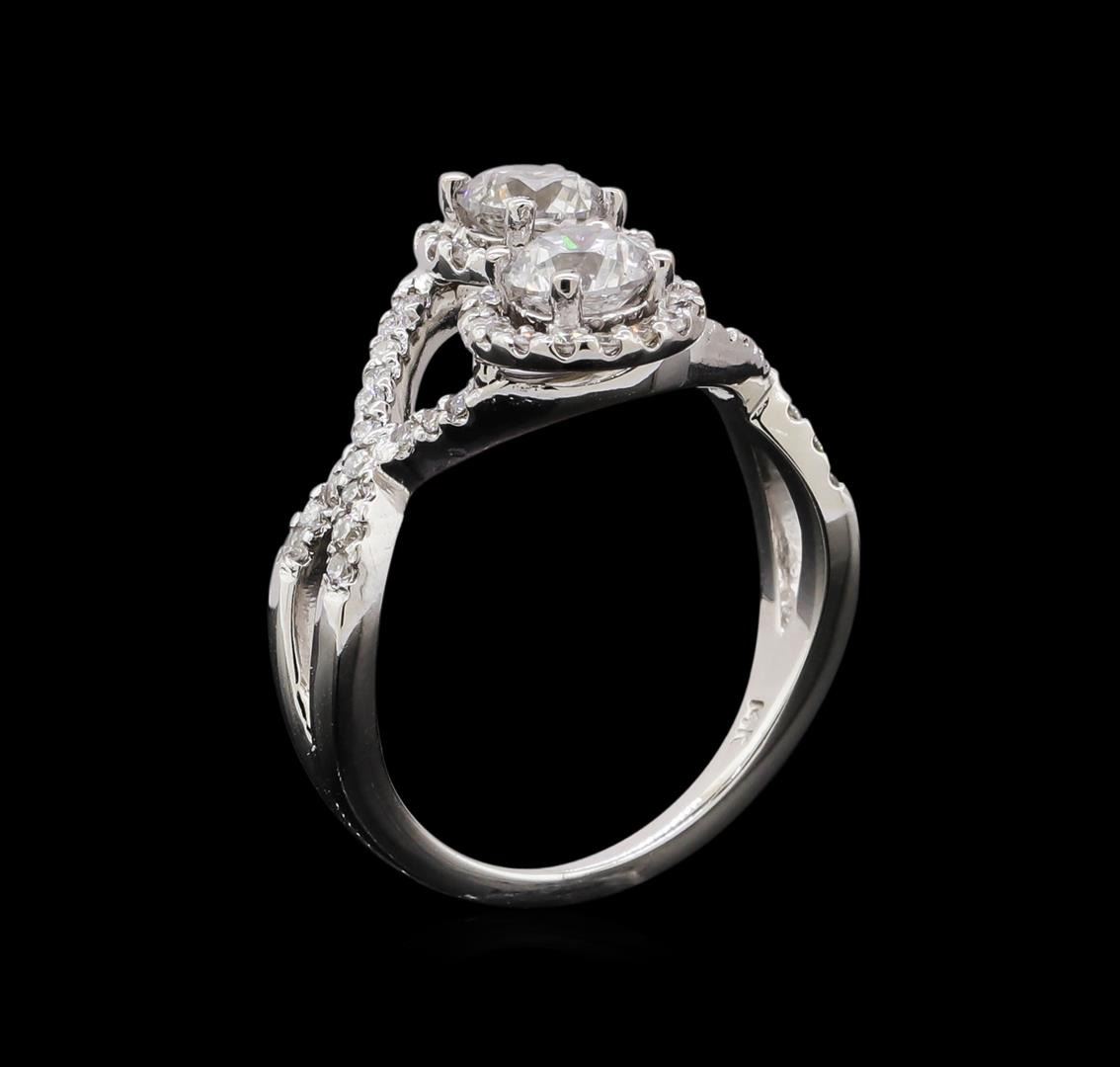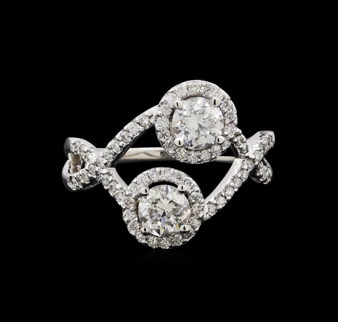 One electronically tested 14KT white gold lady's cast fashion ring with a crossover split shank with a bright polish finish. The featured lady's ring has a shank measuring 1.49 millimeters in width. Identified with markings of '14K'. Condition is new, good workmanship. Containing: Two prong set round brilliant cut diamonds, measuring 4.90 - 4.88 x 3.40mm (depth est.) , 5.00.%. GTCF approximate total weight of 2 Stones = 1.05ct. Graded in the setting. Clarity SI-2 to I-1. Color: I - J Cut Good Sixty-Six prong set round brilliant cut diamonds, measuring 1.25 - 1.15 x 0.74mm (depth est.) approximate total weight of 66 Stones = 0.42ct. Graded in the setting. Clarity SI-1 to I-1. Color: H - I Cut Good. Total Weight of Diamonds 1.47ct.. Total Weight of Ring 4.60gm. GAS Appraised.