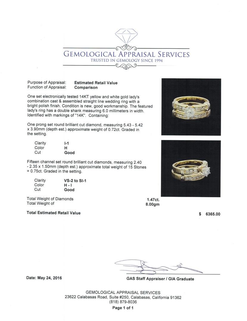 One set electronically tested 14KT yellow and white gold lady's combination cast & assembled straight line wedding ring with a bright polish finish. The featured lady's ring has a double shank measuring 6.0 millimeters in width. Identified with markings of "14K". Condition is new, good workmanship. Containing: One prong set round brilliant cut diamond, measuring 5.43 - 5.42 x 3.90mm (depth est.) approximate weight of 0.72ct. Graded in the setting. Clarity: I-1. Color: Good Fifteen channel set round brilliant cut diamonds, measuring 2.40 - 2.35 x 1.50mm (depth est.) approximate total weight of 15 Stones = 0.75ct. Graded in the setting. Clarity: VS-2 to SI-1. Color: H - I. Cut Good. Total Weight of Diamonds 1.47ct. Total Weight of 8.00gm. GAS Appraised at $6,365.00.