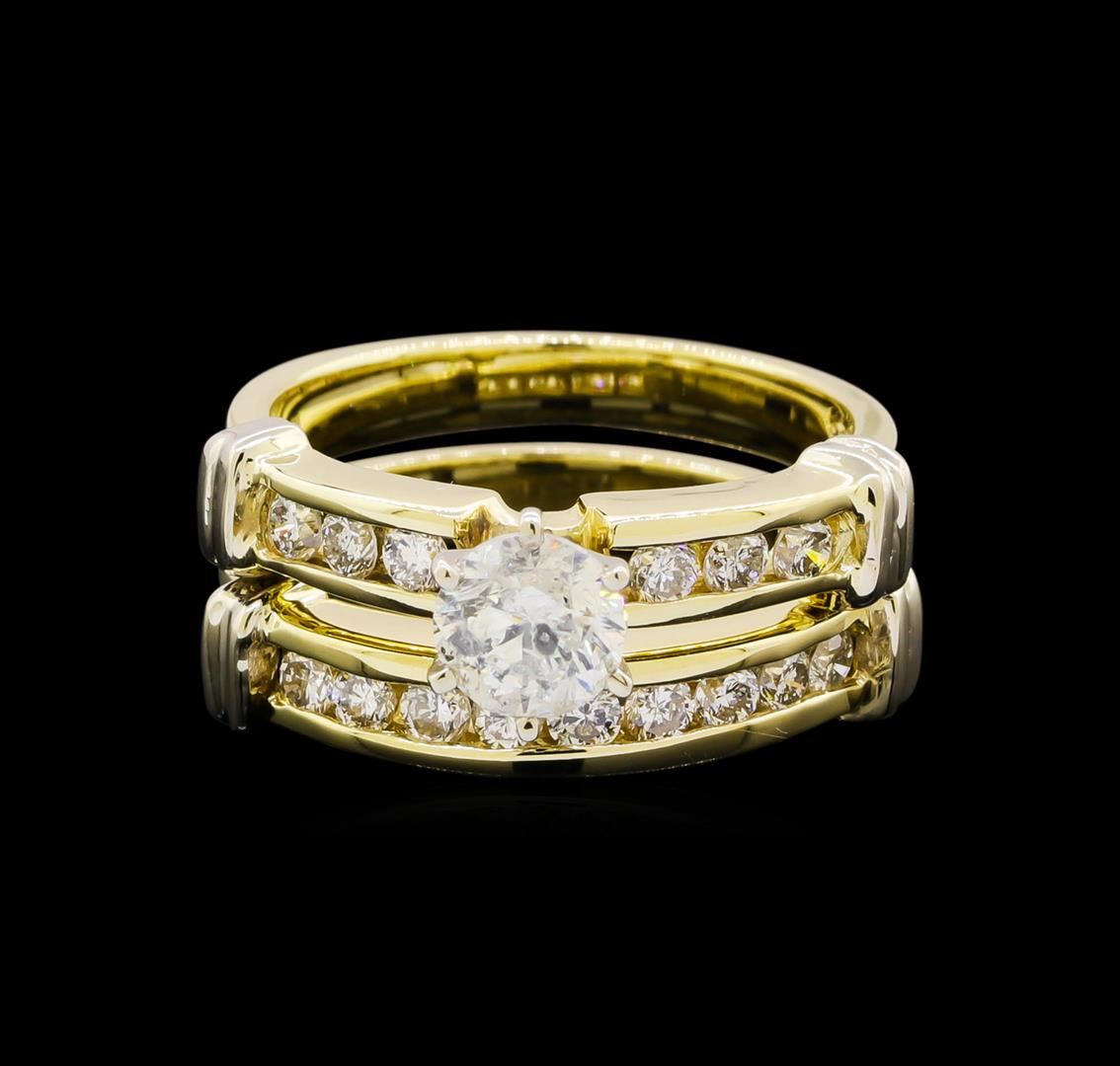 One set electronically tested 14KT yellow and white gold lady's combination cast & assembled straight line wedding ring with a bright polish finish. The featured lady's ring has a double shank measuring 6.0 millimeters in width. Identified with markings of "14K". Condition is new, good workmanship. Containing: One prong set round brilliant cut diamond, measuring 5.43 - 5.42 x 3.90mm (depth est.) approximate weight of 0.72ct. Graded in the setting. Clarity: I-1. Color: Good Fifteen channel set round brilliant cut diamonds, measuring 2.40 - 2.35 x 1.50mm (depth est.) approximate total weight of 15 Stones = 0.75ct. Graded in the setting. Clarity: VS-2 to SI-1. Color: H - I. Cut Good. Total Weight of Diamonds 1.47ct. Total Weight of 8.00gm. GAS Appraised at $6,365.00.