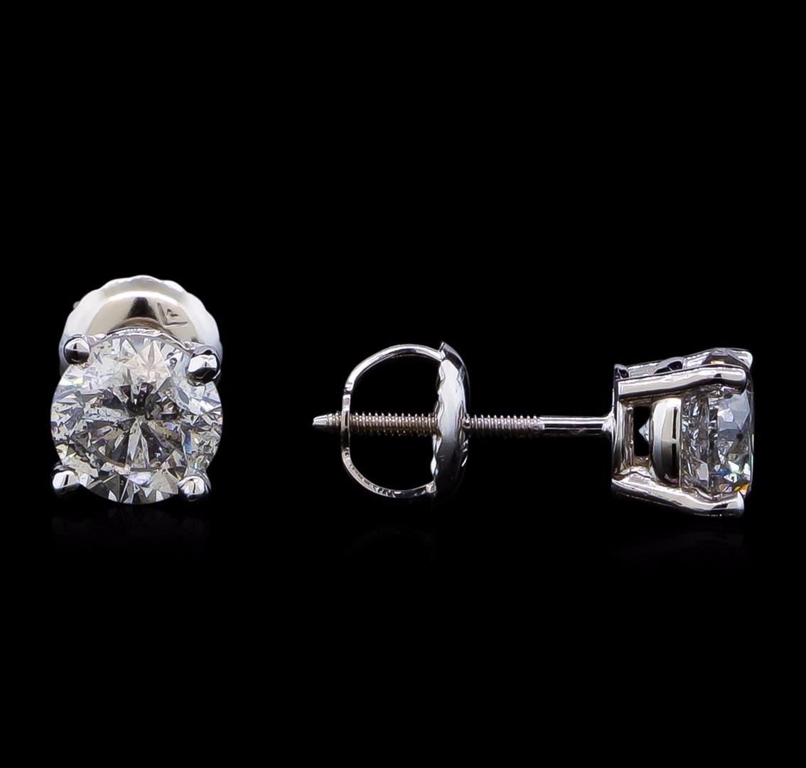 One pair electronically tested 14KT white gold lady's combination cast & assembled diamond stud earrings with threaded posts and screw-on/screw-off backs with a basket setting with a bright polish finish. Identified with markings of "14K". Condition is new, good workmanship. Containing: One prong set round brilliant cut diamond, measuring 5.55 - 5.53 x 3.82mm (depth est.) , 4.00.%. GTCF approximate weight of 0.75ct. Graded in the setting. Clarity: SI-2. Color: Very Good One prong set round brilliant cut diamond, measuring 5.45 - 5.40 x 3.74mm (depth est.) , 5.00.%. GTCF approximate weight of 0.72ct. Graded in the setting. Clarity: SI-2. Color: Good. Total Weight of Diamonds 1.47ct. Total Weight of Stud Earrings 1.10gm. GAS Appraised at $12,330.00.