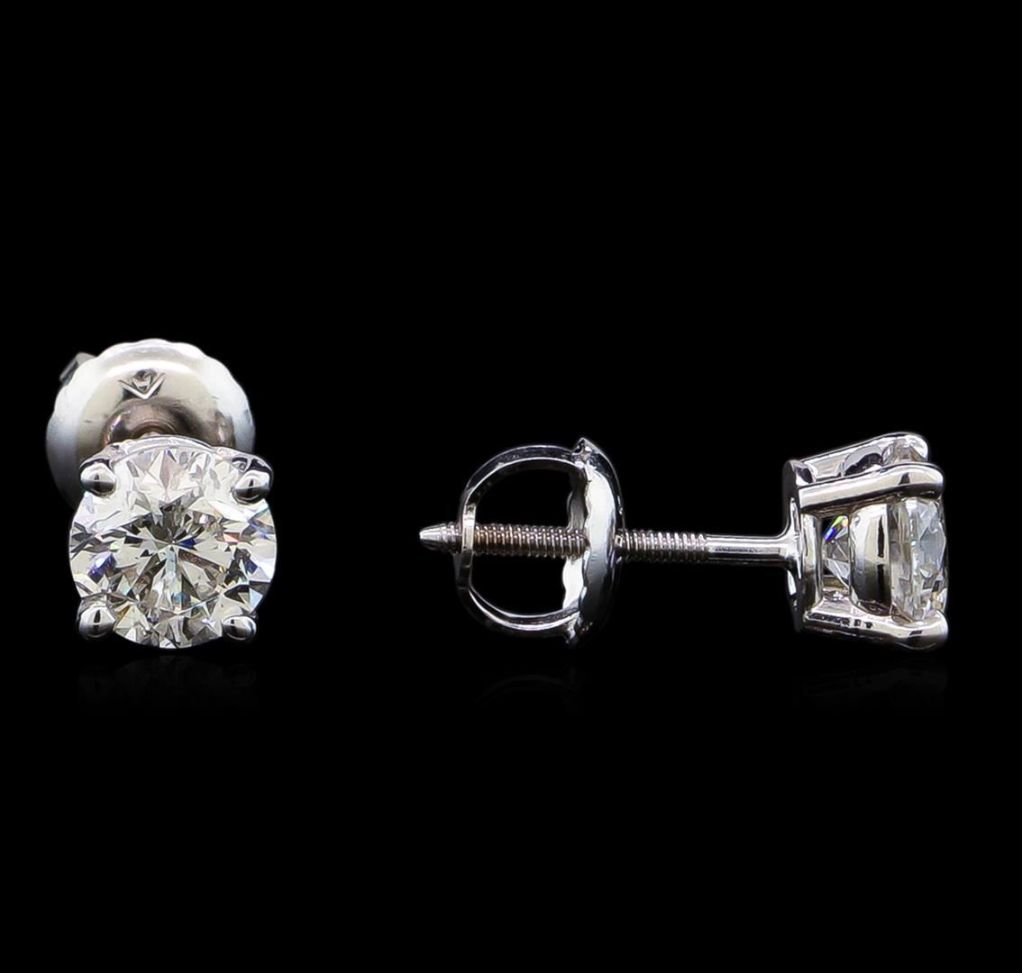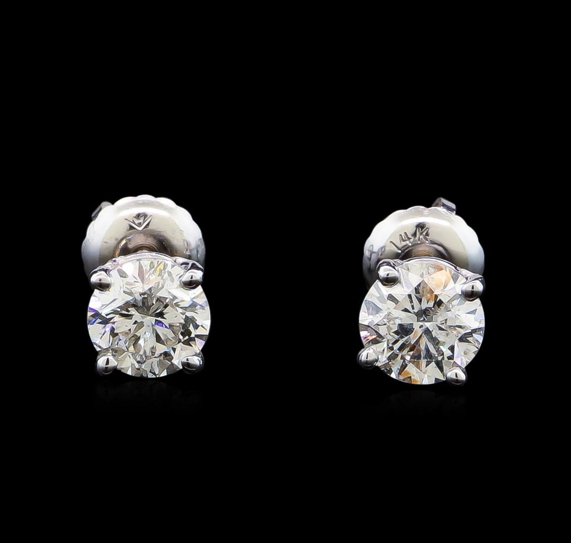 One pair electronically tested 14KT white gold lady's combination cast & assembled diamond stud earrings with threaded posts and screw-on/screw-off backs with a basket setting with a bright polish finish. Identified with markings of "14K". Condition is new, good workmanship. Containing: One prong set round brilliant cut diamond, measuring 5.58 - 5.51 x 3.83mm (depth est.) approximate weight of 0.74ct. Graded in the setting. Clarity: I-1. Color: Good One prong set round brilliant cut diamond, measuring 5.52 - 5.50 x 3.69mm (depth est.) , 5.00.%. GTCF approximate weight of 0.73ct. Graded in the setting. Clarity: I-1. Color: Very Good. Total Weight of Diamonds 1.47ct. Total Weight of Stud Earrings 1.10gm. GAS Appraised at $9,590.00.