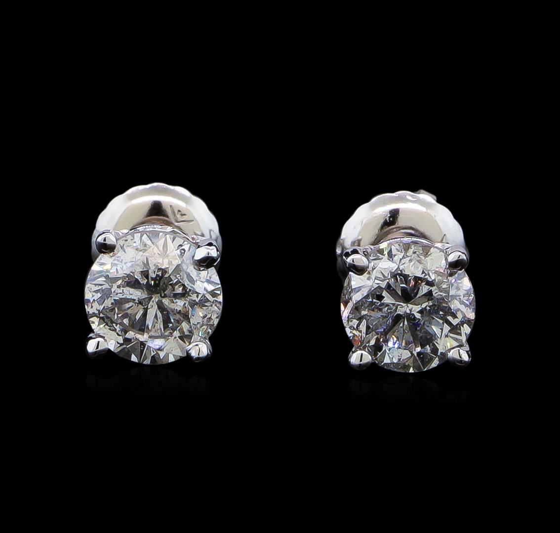 One pair electronically tested 14KT white gold lady's combination cast & assembled diamond stud earrings with threaded posts and screw-on/screw-off backs with a basket setting with a bright polish finish. Identified with markings of "14K". Condition is new, good workmanship. Containing: One prong set round brilliant cut diamond, measuring 5.55 - 5.53 x 3.82mm (depth est.) , 4.00.%. GTCF approximate weight of 0.75ct. Graded in the setting. Clarity: SI-2. Color: Very Good One prong set round brilliant cut diamond, measuring 5.45 - 5.40 x 3.74mm (depth est.) , 5.00.%. GTCF approximate weight of 0.72ct. Graded in the setting. Clarity: SI-2. Color: Good. Total Weight of Diamonds 1.47ct. Total Weight of Stud Earrings 1.10gm. GAS Appraised at $12,330.00.