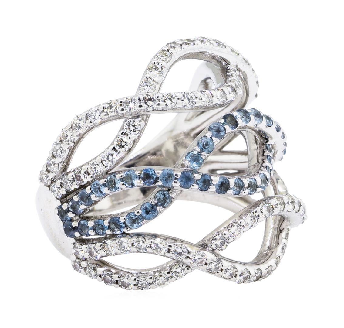 One electronically tested 14KT white gold lady's cast fashion ring with a bright polish finish. The featured lady's ring has a shank measuring 3.40 millimeters wide. Identified with markings of '14K'. Condition is new, good workmanship. Containing: Forty-eight prong set round modified brilliant cut natural aquamarines, measuring 1.60 - 1.50 x 1.09 mm, (depth est.) approximate total weight of 0.96ct., clarity is eye clean, light, moderately strong, blue color, (GIA B 3/4), cut is good. Transmitting light with no distortion, transparent. Colored gemstones are presumed to have been subjected to commonly used enhancement processes. Graded in the setting. Ninety-Six prong set round brilliant cut diamonds, measuring 1.60 - 1.55 x 0.98mm (depth est.) approximate total weight of 96 Stones = 1.47ct. Graded in the setting. Color H - I Clarity VS-2 to SI-1 Cut Very Good. Total Weight of Colored Stones 0.96ct.. Total Weight of Diamonds 1.47ct.. Total Weight of Ring 9.70gm GAS Appraised at $5860.00. GAS Appraised at $5,860.00.