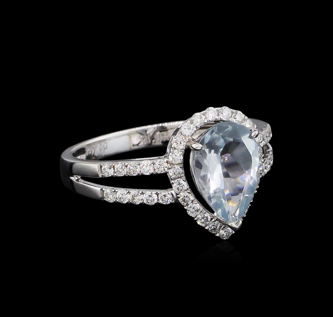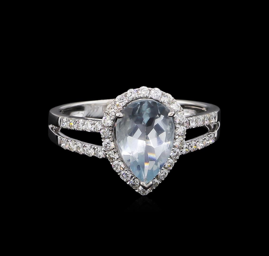 One electronically tested 18KT white gold lady's cast fashion ring with a split shank halo with a bright polish finish. The featured lady's ring has a shank measuring 2.20 millimeters wide. Trademark is Orianne. Identified with markings of "18K". Condition is new, good workmanship. Containing: One prong set pear modified brilliant cut natural aquamarine, measuring 10.15 x 6.84 x 4.19mm, approximate weight of 1.47ct., clarity is moderately included, type I, light, very slightly grayish, very slightly greenish blue color, (GIA vslgB 3/3), cut is good. Transmitting light with a minimum of distortion, transparent. Colored gemstones are presumed to have been subjected to commonly used enhancement processes. Graded in the setting. Forty-Two prong set round brilliant cut diamonds, measuring 1.45 - 1.35 x 0.84mm (depth est.) approximate total weight of 42 Stones = 0.44ct. Graded in the setting. Clarity: VS-2 to SI-1. Color: H - I. Cut Very Good. Total Weight of Colored Stones 1.47ct. Total Weight of Diamonds 0.44ct. Total Weight of Ring 3.10gm. GAS Appraised at $2,985.00.