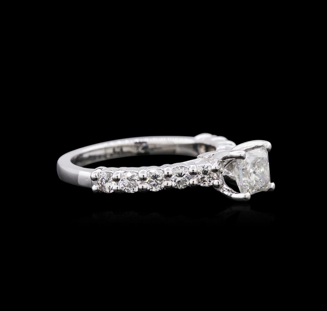 One electronically tested 14KT white gold ladies cast diamond engagement ring with a bright polish finish. Identified with markings of "14K". Condition is new. Containing: One prong set princess cut diamond, measuring 4.90 x 4.96 x 3.72mm (depth est.) approximate weight of 0.82ct. Clarity: I-2. Color: I, Cut is Good. Ten prong set round brilliant cut diamonds, measuring 2.50 - 2.50 x 1.50mm (depth est.) approximate total weight of 10 Stones = 0.65ct. Clarity: SI-1. Color: I - J, Cut is Good. Diamonds are graded in the mounting, unless otherwise stated. Total Weight of Diamonds 1.47ct. Total Weight of Engagement Ring 3.80 grams. GGL Appraised at $4,005.00.