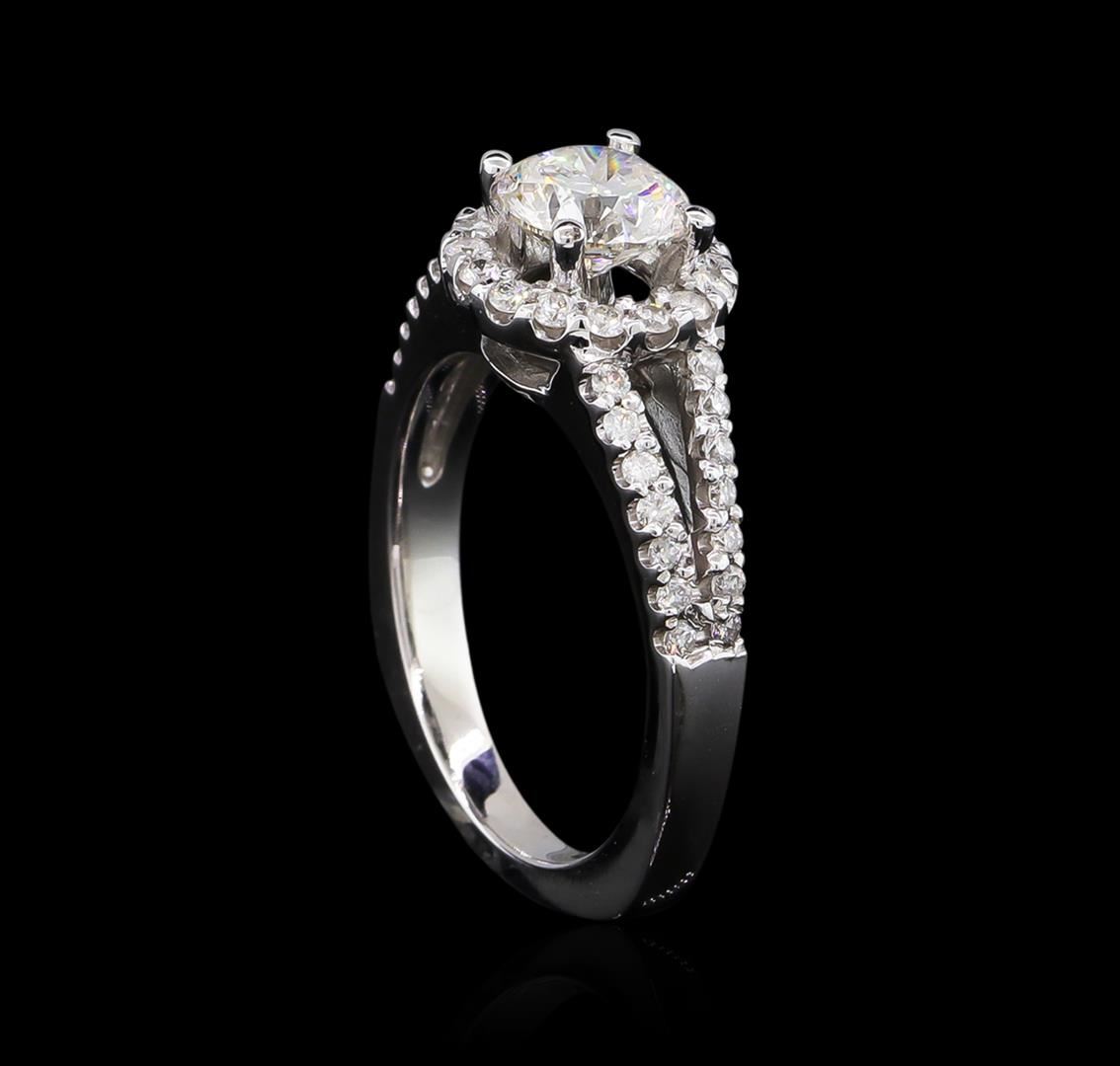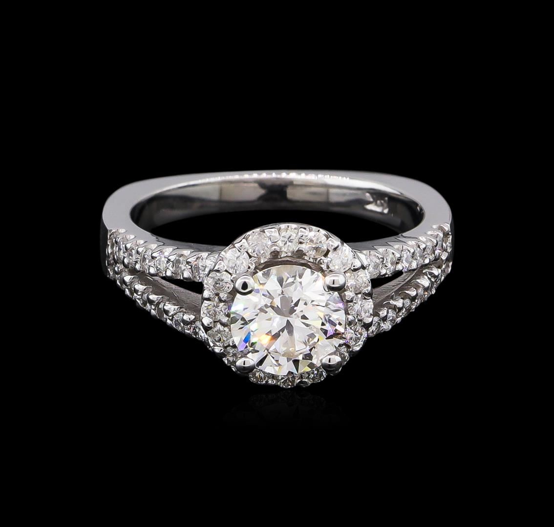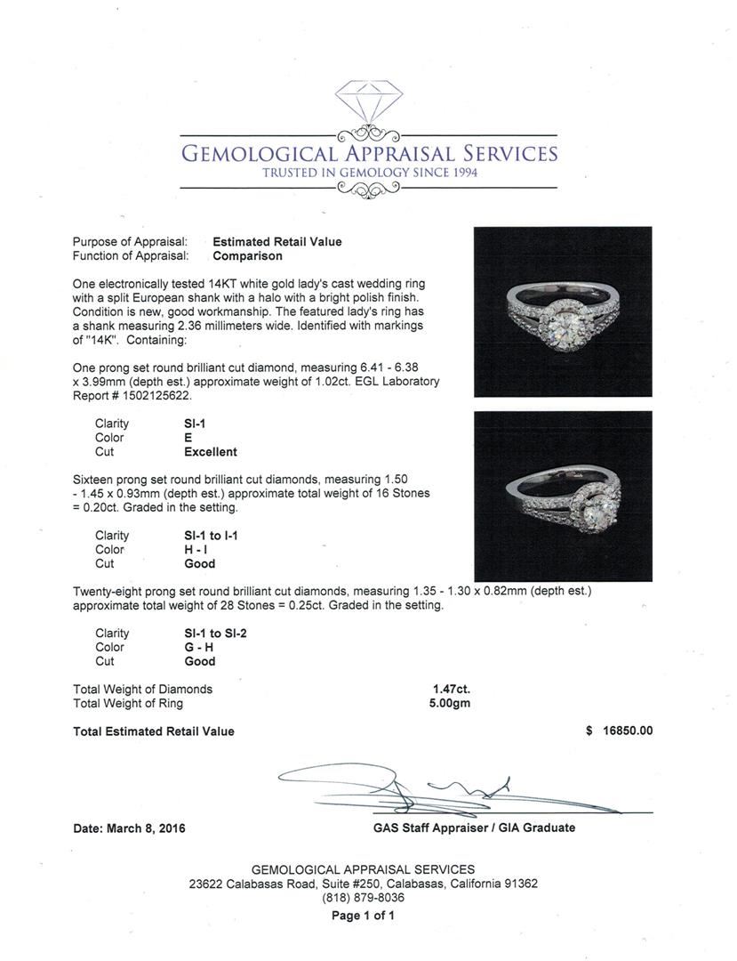 One electronically tested 14KT white gold lady's cast wedding ring with a split European shank with a halo with a bright polish finish. The featured lady's ring has a shank measuring 2.36 millimeters wide. Identified with markings of "14K". Condition is new, good workmanship. Containing: One prong set round brilliant cut diamond, measuring 6.41 - 6.38 x 3.99mm (depth est.) approximate weight of 1.02ct. EGL Laboratory Report # 1502125622. Clarity: SI-1. Color: E. Cut Excellent Sixteen prong set round brilliant cut diamonds, measuring 1.50 - 1.45 x 0.93mm (depth est.) approximate total weight of 16 Stones = 0.20ct. Graded in the setting. Clarity: SI-1 to I-1. Color: H - I. Cut Good Twenty-Eight prong set round brilliant cut diamonds, measuring 1.35 - 1.30 x 0.82mm (depth est.) approximate total weight of 28 Stones = 0.25ct. Graded in the setting. Clarity: SI-1 to SI-2. Color: G - H. Cut Good. Total Weight of Diamonds 1.47ct. Total Weight of Ring 5.00gm. GAS Appraised at $16,850.00.