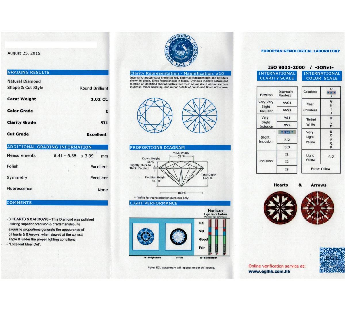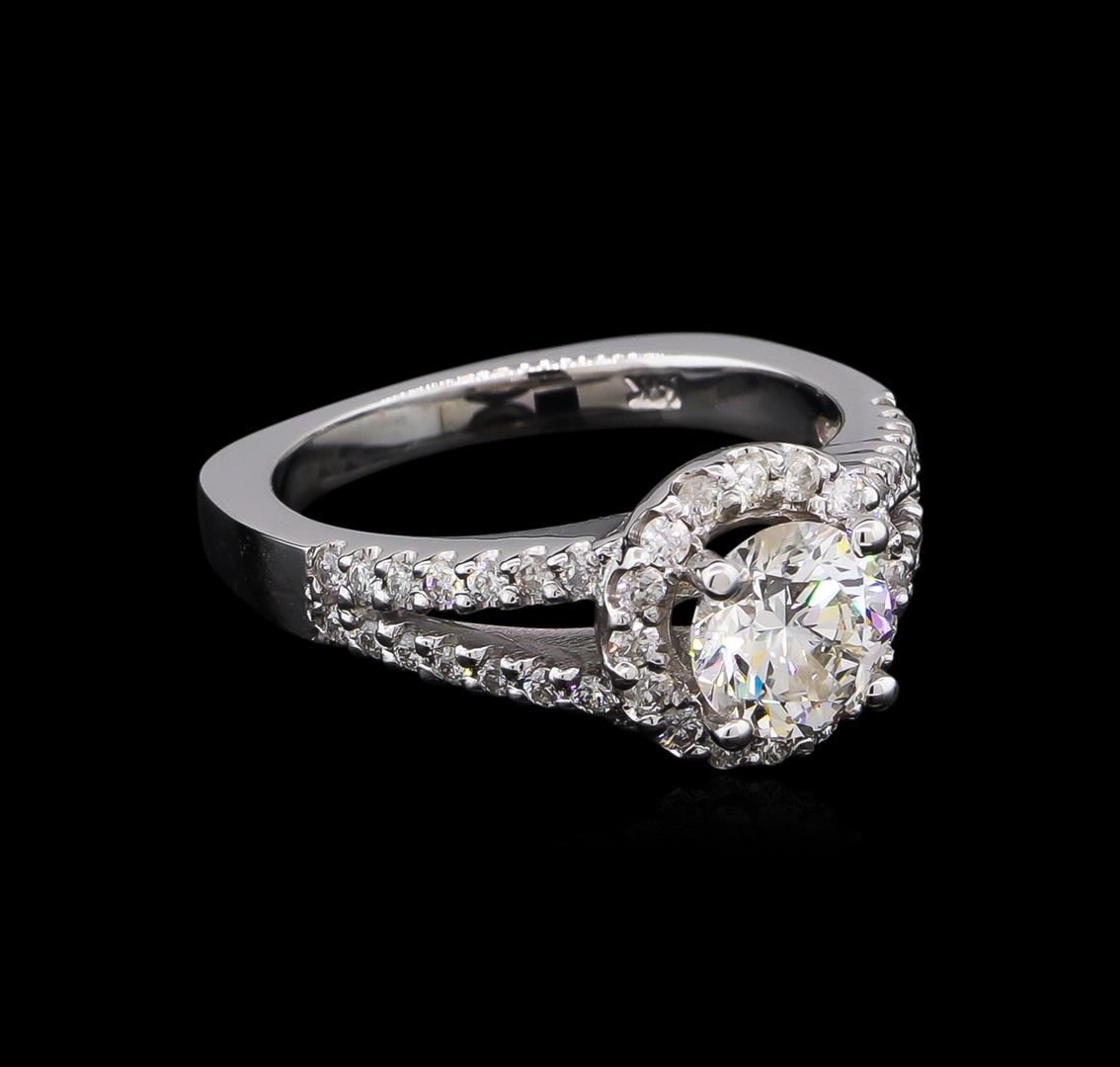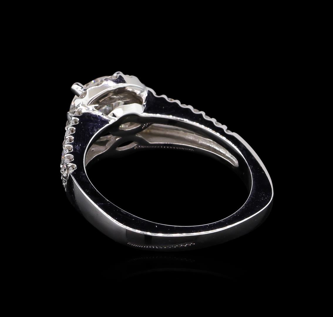 One electronically tested 14KT white gold lady's cast wedding ring with a split European shank with a halo with a bright polish finish. The featured lady's ring has a shank measuring 2.36 millimeters wide. Identified with markings of "14K". Condition is new, good workmanship. Containing: One prong set round brilliant cut diamond, measuring 6.41 - 6.38 x 3.99mm (depth est.) approximate weight of 1.02ct. EGL Laboratory Report # 1502125622. Clarity: SI-1. Color: E. Cut Excellent Sixteen prong set round brilliant cut diamonds, measuring 1.50 - 1.45 x 0.93mm (depth est.) approximate total weight of 16 Stones = 0.20ct. Graded in the setting. Clarity: SI-1 to I-1. Color: H - I. Cut Good Twenty-Eight prong set round brilliant cut diamonds, measuring 1.35 - 1.30 x 0.82mm (depth est.) approximate total weight of 28 Stones = 0.25ct. Graded in the setting. Clarity: SI-1 to SI-2. Color: G - H. Cut Good. Total Weight of Diamonds 1.47ct. Total Weight of Ring 5.00gm. GAS Appraised at $16,850.00.