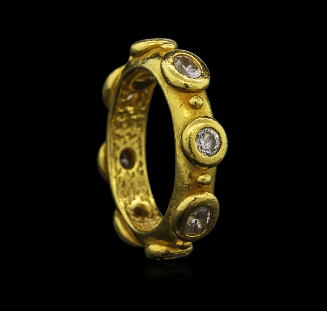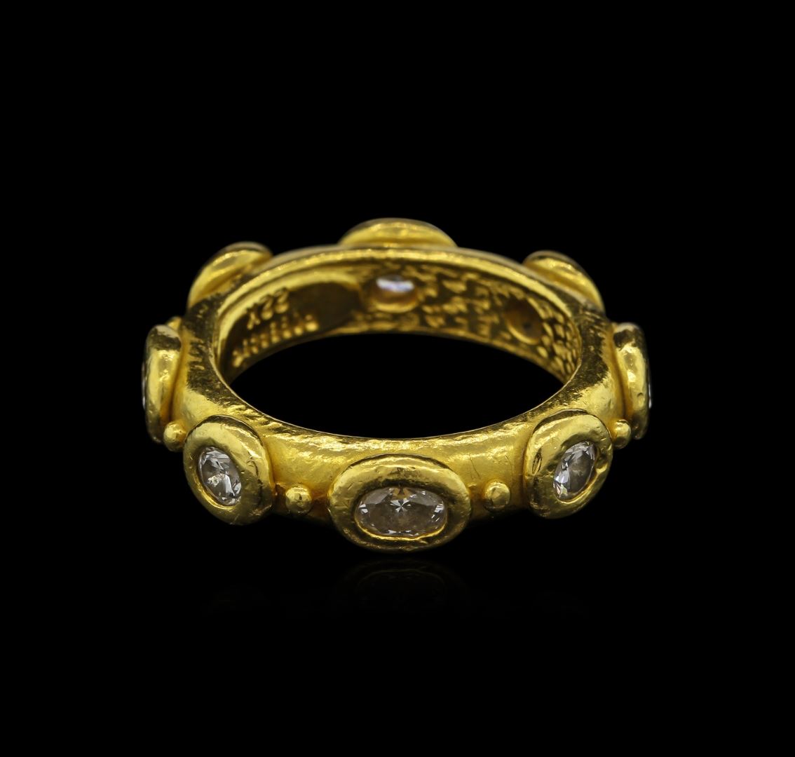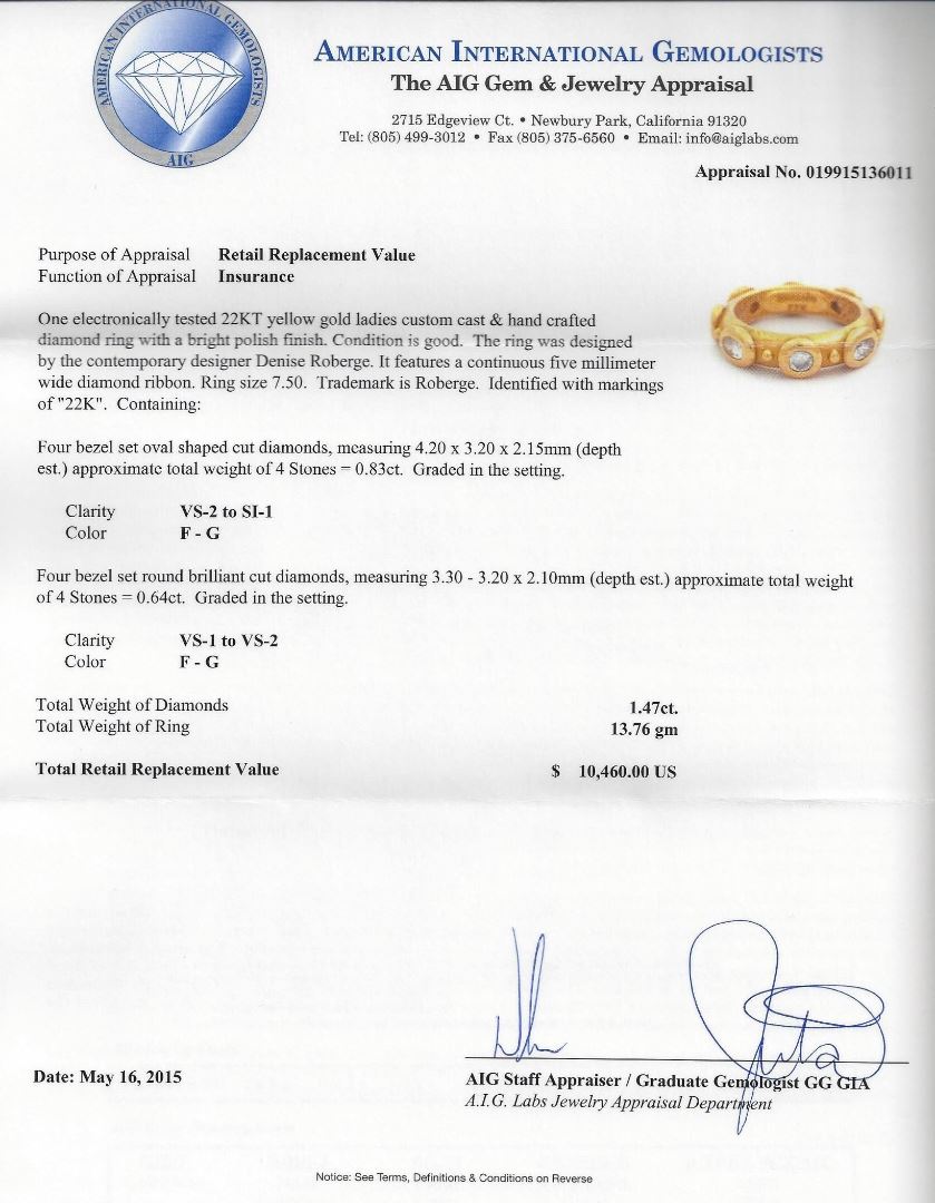 One electronically tested 22KT yellow gold ladies custom cast & hand crafted diamond ring with a bright polish finish. Condition is good. The ring was designed by the contemporary designer Denise Roberge. It features a continuous five millimeter wide diamond ribbon. Ring size 7.50. Trademark is Roberge. Identified with markings of "22K". Containing: Four bezel set oval shaped cut diamonds, measuring 4.20 x 3.20 x 2.15mm (depth est.) approximate total weight of 4 Stones = 0.83ct. Graded in the setting. Clarity: VS-2 to SI-1. Color: F - G. Four bezel set round brilliant cut diamonds, measuring 3.30 - 3.20 x 2.10mm (depth est.) approximate total weight of 4 Stones = 0.64ct. Graded in the setting. Clarity: VS-1 to VS-2. Color: F - G. Total Weight of Diamonds: 1.47ct. Total Weight of Ring: 13.76 gm. AIG Appraised at $10,460.00.