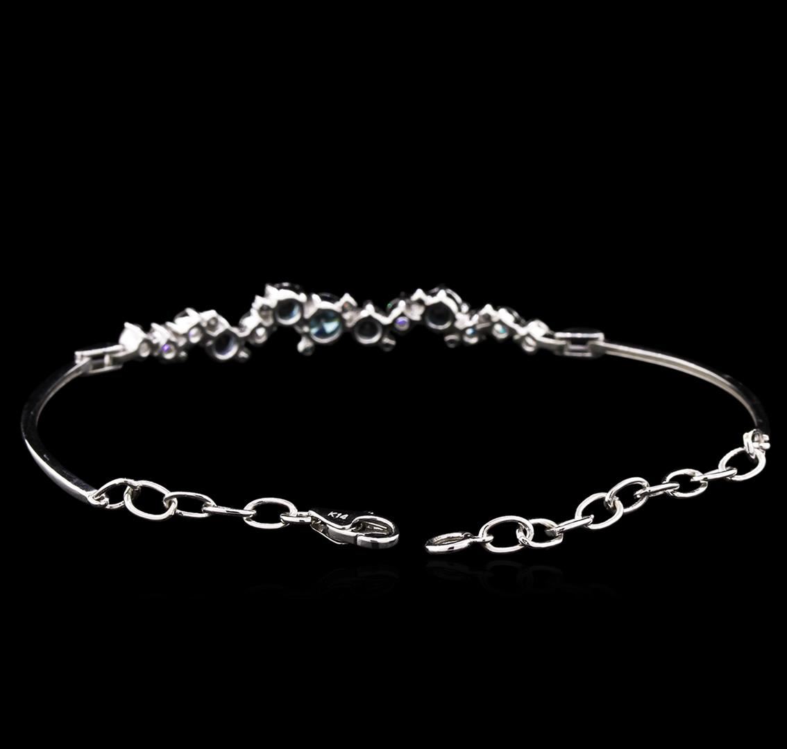 One electronically tested 14KT white gold lady's combination cast & assembled fashion bracelet with a lobster claw clasp with a bright polish finish. The featured ladies bracelet measures 7.00 inches in length. Identified with markings of "K14". Condition is new, good workmanship. Containing: Four prong set round standard brilliant cut natural blue sapphires, measuring 4.30 - 4.20 x 2.50 mm, approximate total weight of 1.48ct., clarity is slightly included, type II, medium light, very slightly grayish, blue color, (GIA B 4/3), cut is good. Colored gemstones are presumed to have been subjected to commonly used enhancement processes. Graded in the setting. One prong set round brilliant cut diamond, measuring 5.10 - 5.05 x 2.92mm (depth est.) approximate weight of 0.47ct. Graded in the setting. Clarity: I-1 Cut Good Five prong set round brilliant cut diamonds, measuring 1.70 - 1.60 x 0.99mm (depth est.) approximate total weight of 5 Stones = 0.08ct. Graded in the setting. Clarity: I-1 Cut Good Eight prong set round brilliant cut diamonds, measuring 3.10 - 3.00 x 1.83mm (depth est.) approximate total weight of 8 Stones = 0.83ct. Graded in the setting. Clarity: SI-1 to I-1. Color: G - I. Cut Good Five prong set round brilliant cut diamonds, measuring 1.30 - 1.20 x 0.81mm (depth est.) approximate total weight of 5 Stones = 0.04ct. Graded in the setting. Clarity: SI-2 to I-1. Color: H - I. Cut Good. Total Weight of Colored Stones 1.48ct. Total Weight of Diamonds 1.42ct. Total Weight of Bracelet 6.70gm. GAS Appraised at $5,195.00.