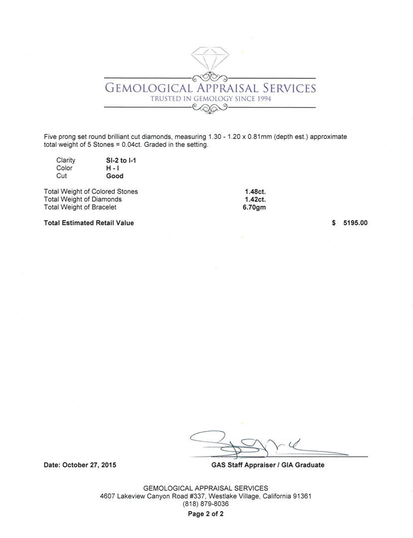 One electronically tested 14KT white gold lady's combination cast & assembled fashion bracelet with a lobster claw clasp with a bright polish finish. The featured ladies bracelet measures 7.00 inches in length. Identified with markings of "K14". Condition is new, good workmanship. Containing: Four prong set round standard brilliant cut natural blue sapphires, measuring 4.30 - 4.20 x 2.50 mm, approximate total weight of 1.48ct., clarity is slightly included, type II, medium light, very slightly grayish, blue color, (GIA B 4/3), cut is good. Colored gemstones are presumed to have been subjected to commonly used enhancement processes. Graded in the setting. One prong set round brilliant cut diamond, measuring 5.10 - 5.05 x 2.92mm (depth est.) approximate weight of 0.47ct. Graded in the setting. Clarity: I-1 Cut Good Five prong set round brilliant cut diamonds, measuring 1.70 - 1.60 x 0.99mm (depth est.) approximate total weight of 5 Stones = 0.08ct. Graded in the setting. Clarity: I-1 Cut Good Eight prong set round brilliant cut diamonds, measuring 3.10 - 3.00 x 1.83mm (depth est.) approximate total weight of 8 Stones = 0.83ct. Graded in the setting. Clarity: SI-1 to I-1. Color: G - I. Cut Good Five prong set round brilliant cut diamonds, measuring 1.30 - 1.20 x 0.81mm (depth est.) approximate total weight of 5 Stones = 0.04ct. Graded in the setting. Clarity: SI-2 to I-1. Color: H - I. Cut Good. Total Weight of Colored Stones 1.48ct. Total Weight of Diamonds 1.42ct. Total Weight of Bracelet 6.70gm. GAS Appraised at $5,195.00.