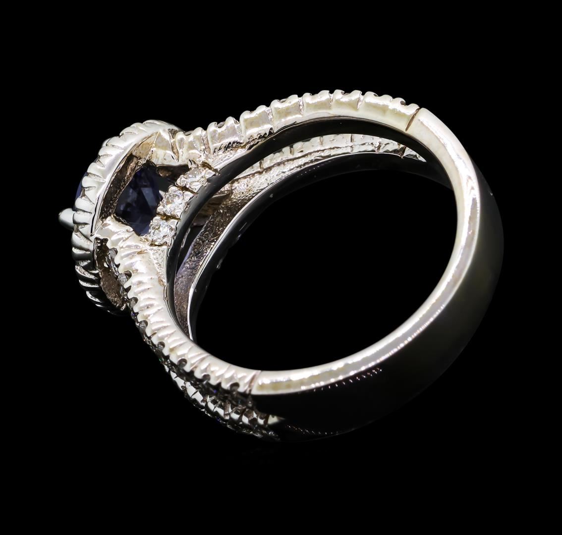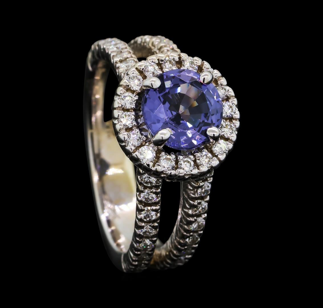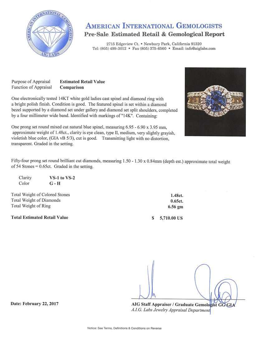 One electronically tested 14KT white gold ladies cast spinel and diamond ring with a bright polish finish. The featured spinel is set within a diamond bezel supported by a diamond set under gallery and diamond set split shoulders, completed by a four millimeter wide band. Identified with markings of '14K'. Condition is good. Containing: One prong set round mixed cut natural blue spinel, measuring 6.95 - 6.90 x 3.95 mm, approximate weight of 1.48ct., clarity is eye clean, type II, medium, very slightly grayish, violetish blue color, (GIA vB 5/3), cut is good. Transmitting light with no distortion, transparent. Graded in the setting. Fifty-Four prong set round brilliant cut diamonds, measuring 1.50 - 1.30 x 0.84mm (depth est.) approximate total weight of 54 Stones = 0.65ct. Graded in the setting. Clarity VS-1 to VS-2. Color: G - H. Total Weight of Colored Stones 1.48ct.. Total Weight of Diamonds 0.65ct.. Total Weight of Ring 6.56gm. AIG Appraised at $5,710.00.