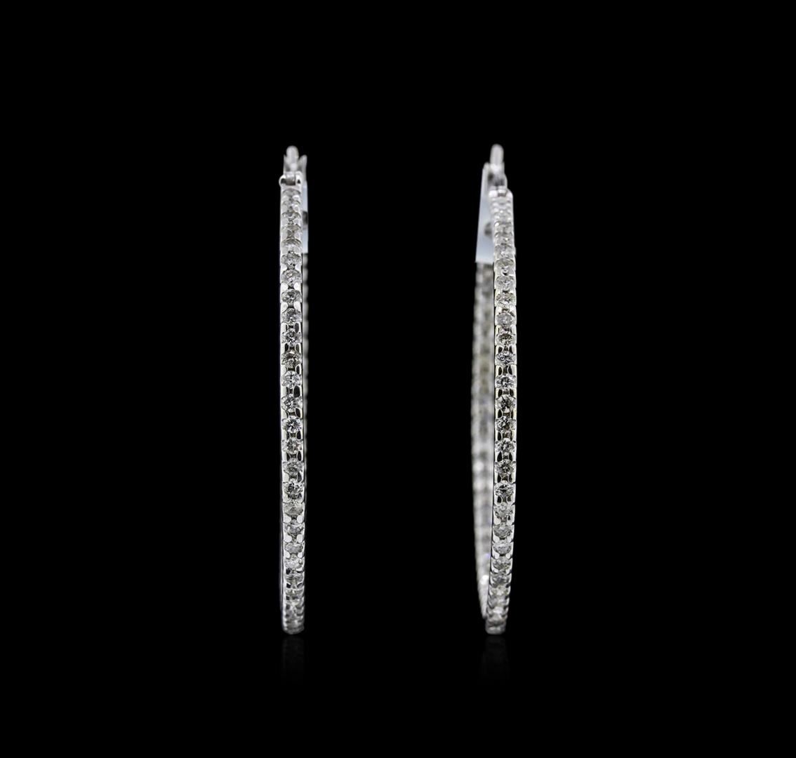 One pair electronically tested 18KT white gold ladies cast diamond hoop earrings with hinged clip backs with a bright polish finish. Identified with markings of "750". Condition is new. Containing: One Hundred Twenty prong set round brilliant cut diamonds, measuring 1.50 - 1.50 x 0.90mm (depth est.) approximate total weight of 120 Stones = 1.48ct. Clarity: SI-2 to I-2. Color: F - H, Cut is Good. Diamonds are graded in the mounting, unless otherwise stated. Total Weight of Diamonds 1.48ct. Total Weight of Hoop Earrings 7.80gm. GGL Appraised at $3,215.00.