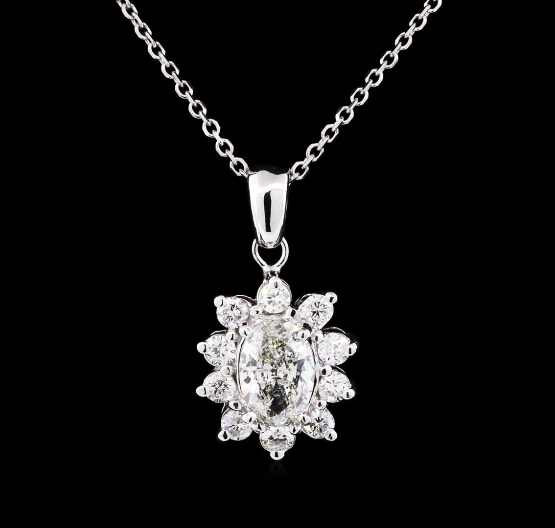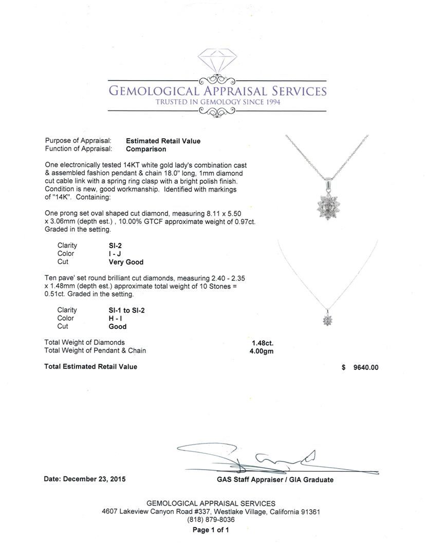 One electronically tested 14KT white gold lady's combination cast & assembled fashion pendant & chain 18.0" long, 1mm diamond cut cable link with a spring ring clasp with a bright polish finish. Identified with markings of "14K". Condition is new, good workmanship. Containing: One prong set oval shaped cut diamond, measuring 8.11 x 5.50 x 3.06mm (depth est.) , 10.00% GTCF approximate weight of 0.97ct. Graded in the setting. Clarity: SI-2. Color: I - J. Cut Very Good Ten pave' set round brilliant cut diamonds, measuring 2.40 - 2.35 x 1.48mm (depth est.) approximate total weight of 10 Stones = 0.51ct. Graded in the setting. Clarity: SI-1 to SI-2. Color: H - I. Cut Good. Total Weight of Diamonds 1.48ct. Total Weight of Pendant & Chain 4.00gm. GAS Appraised at $9,640.00.