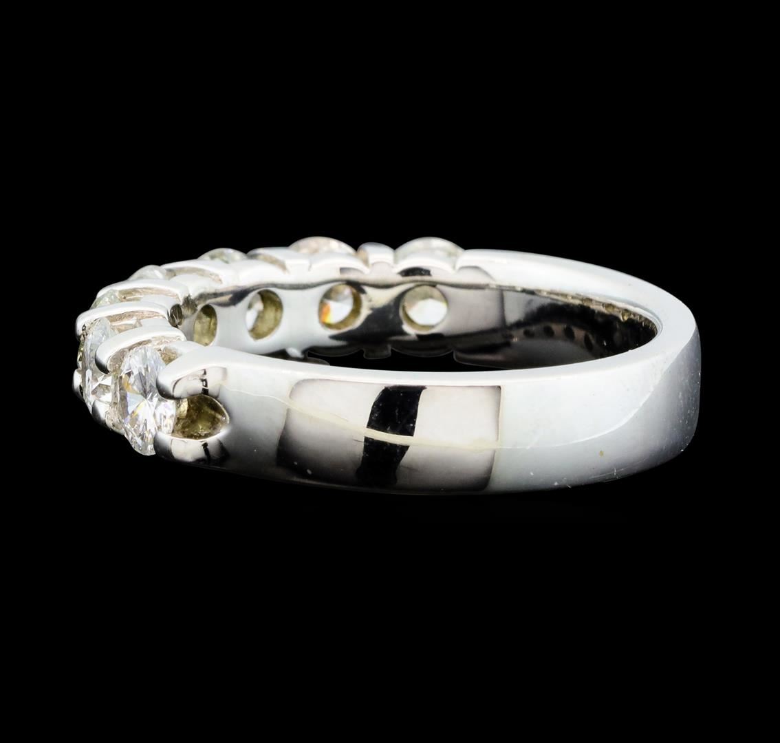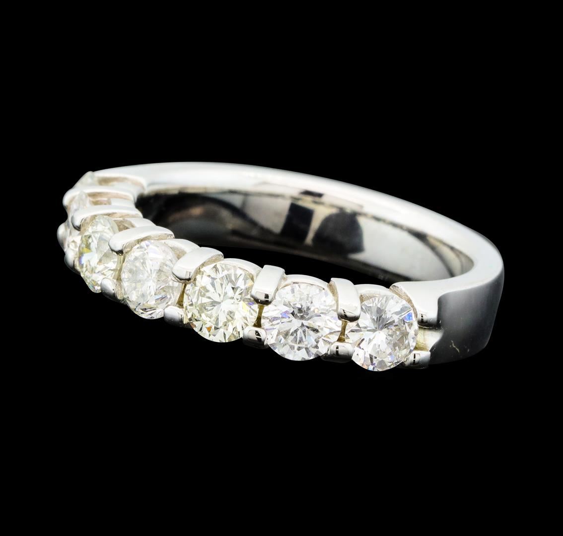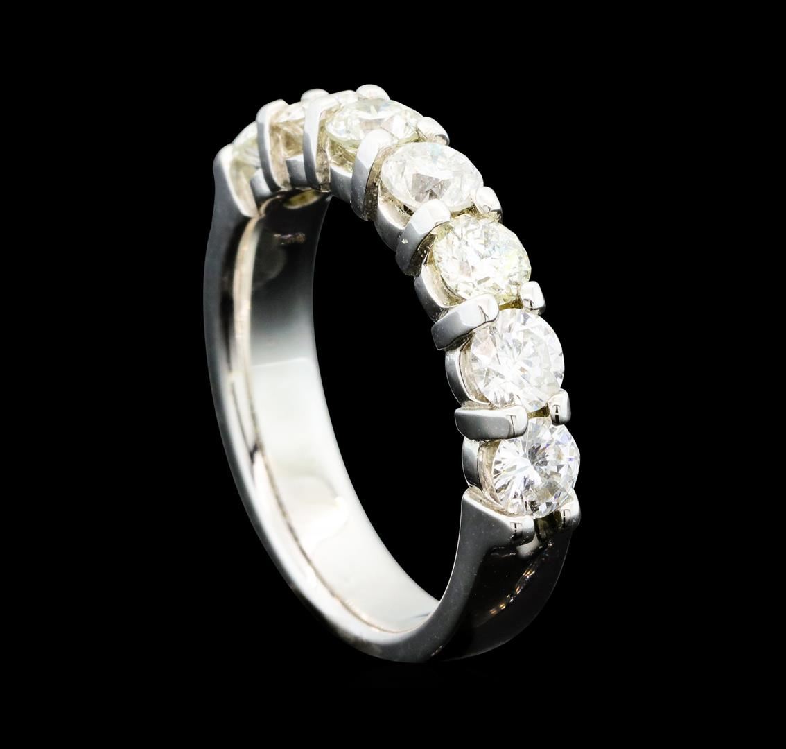 One electronically tested 14KT white gold lady's cast straight line fashion ring with a bright polish finish. The featured lady's ring has a shank measuring 4.10 millimeters wide. Identified with markings of '14K'. Condition is new, good workmanship. Containing: Seven shared prong set round brilliant cut diamonds, measuring 3.80 - 3.75 x 2.34mm (depth est.) approximate total weight of 7 Stones = 1.48ct. Graded in the setting. Clarity SI-2 to I-1. Color: G - J Cut Good. Total Weight of Diamonds 1.48ct.. Total Weight of Ring 5.00gm GAS Appraised at $4,505.00.