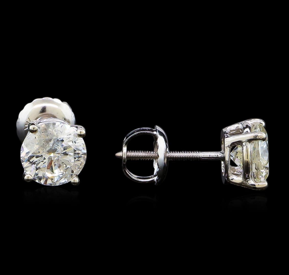 One pair electronically tested 14KT white gold lady's combination cast & assembled diamond stud earrings with threaded posts and screw-on/screw-off backs with a basket setting with a bright polish finish. Identified with markings of "14K". Condition is new, good workmanship. Containing: One prong set round brilliant cut diamond, measuring 5.81 - 5.79 x 3.60mm (depth est.) approximate weight of 0.75ct. Graded in the setting. Clarity: I-2. Color: G - Good One prong set round brilliant cut diamond, measuring 5.81 - 5.78 x 3.57mm (depth est.) approximate weight of 0.73ct. Graded in the setting. Clarity: I-1. Color: H - I. Cut Good. Total Weight of Diamonds 1.48ct. Total Weight of Stud Earrings 1.20gm. GAS Appraised at $7,755.00.