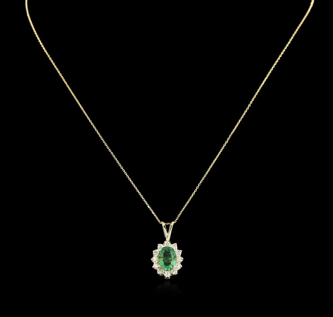 One electronically tested 14KT yellow gold lady's cast pendant & chain 16.0" long,.7mm diamond cut cable link with a spring ring clasp with a halo with a bright polish finish. Identified with markings of "14K". Condition is new, good workmanship. Containing: One prong set oval modified brilliant cut natural emerald, measuring 9.07 x 7.01 x 3.78mm, 8% bulge factor, approximate weight of 1.48ct., clarity is moderately included, type III, medium, very slightly grayish, very slightly bluish green color, (GIA vslbG 5/3), cut is good. Transmitting light somewhat diffusely, transparent to translucent. Naturally occurring internal & external characteristics are present. Indications of oil residue. Graded in the setting. Twelve prong set round brilliant cut diamonds, measuring 2.15 - 2.10 x 1.34mm (depth est.) approximate total weight of 12 Stones = 0.43ct. Graded in the setting. Clarity: SI-2 to I-1. Color: H - J. Cut Good. Total Weight of Colored Stones 1.48ct. Total Weight of Diamonds 0.43ct. Total Weight of Pendant & Chain 3.20gm. GAS Appraised at $2,690.00.
