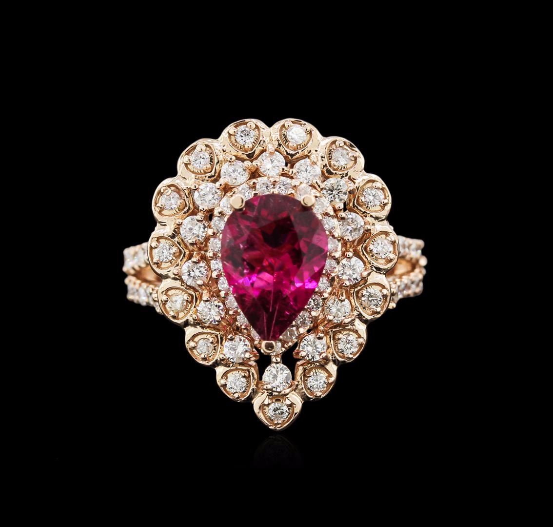 One electronically tested 14KT rose gold ladies cast rubellite tourmaline and diamond ring with a bright polish finish. The featured rubellite tourmaline is set within tiered diamond bezels supported by diamond set split shoulders, completed by a two and one-half millimeter wide band. Identified with markings of "K14". Condition is new, good workmanship. Containing: One prong set pear mixed cut natural rubellite approximate weight of 1.48ct., clarity is slightly included, type III, dark, very slightly brownish, strongly purplish red color, (GIA stpR 7/3), cut is good. Transmitting light with a minimum of distortion, transparent. Naturally occurring internal & external characteristics are present. Graded in the setting. Seventy-Four prong set round brilliant cut diamonds approximate total weight of 74 Stones = 0.83ct. Graded in the setting. Clarity I-1 to I-2 Color G - I. Total Weight of Colored Stones 1.48ct. Total Weight of Diamonds 0.83ct. Total Weight of Ring 7.13 grams. AIG Appraised at $4,000.00.