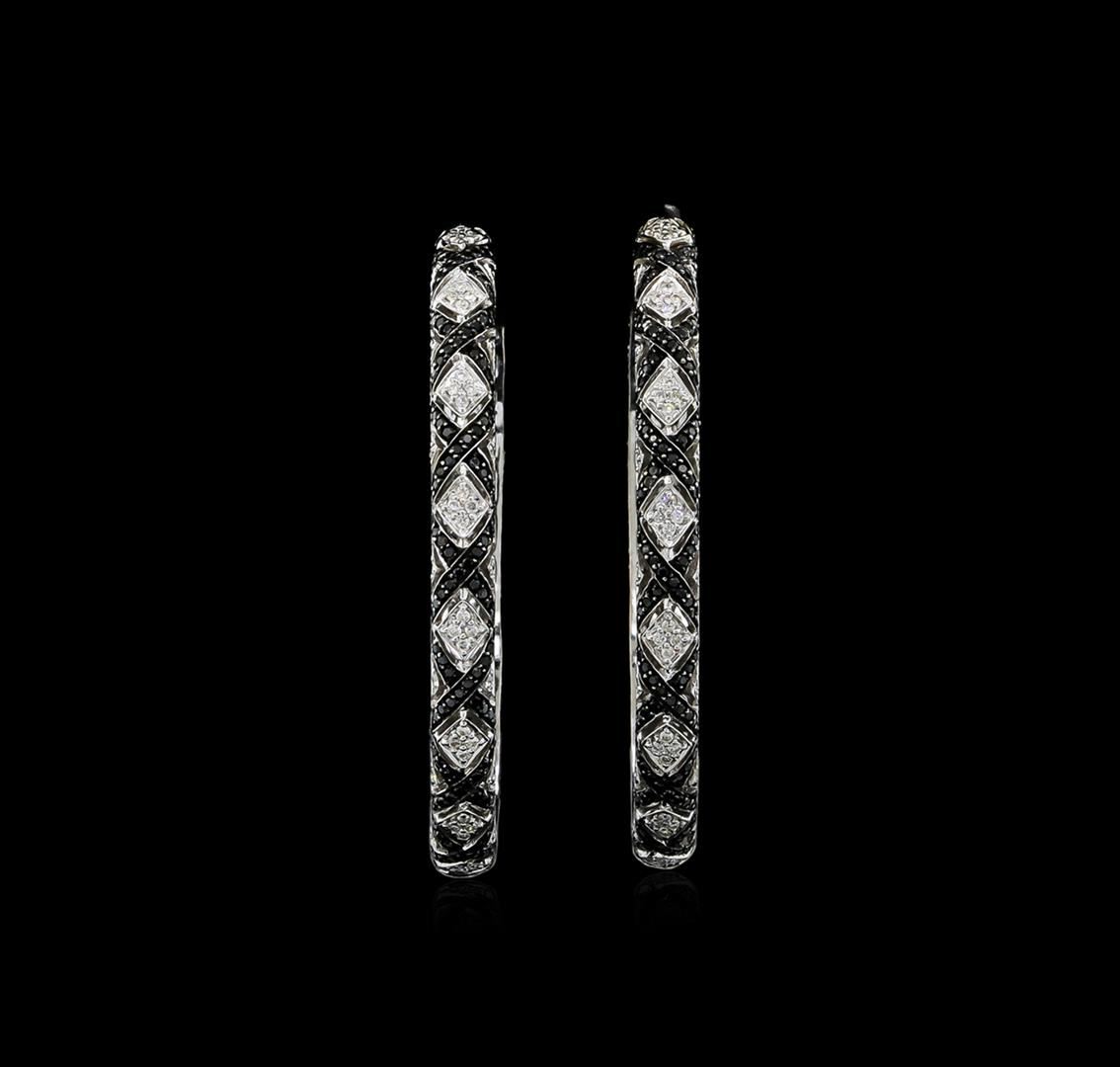 One pair electronically tested 18KT white gold ladies cast black and white diamond hoop earrings with screw backs. Each one and three-quarter inch in diameter hoop earring features a white diamond curvature with black diamond "x" accents. Bright and anodized finish. Condition is good. Containing: One Hundred Seventy-Two bead set round brilliant cut diamonds, measuring 1.10 - 1.00 x 0.63mm (depth est.) approximate total weight of 172 Stones = 0.82ct. Graded in the setting. Clarity: SI-1 to I-1. Color: G - I Four Hundred Ninety-Two bead set round brilliant cut diamonds, measuring 0.70 - 0.70 x 0.42mm (depth est.) approximate total weight of 492 Stones = 0.66ct. Indications of multiple laboratory enhancements. The specific gravity of black diamond is 3.120 to 3.165. Diamond tester results are non-reactive. Graded in the setting. Clarity Déclassé‚. Color: Fancy Black; Irradiated. Total Weight of Diamonds 1.48ct. Total Weight of Hoop Earrings 17.50gm. AIG Appraised at $10,990.00.
