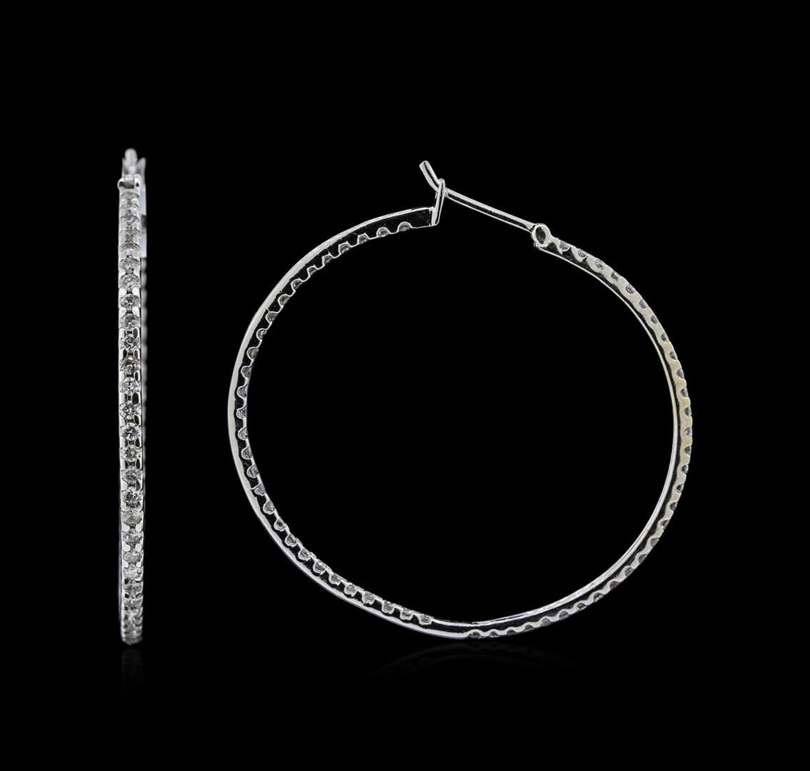 One pair electronically tested 18KT white gold ladies cast diamond hoop earrings with hinged clip backs with a bright polish finish. Identified with markings of "750". Condition is new. Containing: One Hundred Twenty prong set round brilliant cut diamonds, measuring 1.50 - 1.50 x 0.90mm (depth est.) approximate total weight of 120 Stones = 1.48ct. Clarity: SI-2 to I-2. Color: F - H, Cut is Good. Diamonds are graded in the mounting, unless otherwise stated. Total Weight of Diamonds 1.48ct. Total Weight of Hoop Earrings 7.80gm. GGL Appraised at $3,215.00.