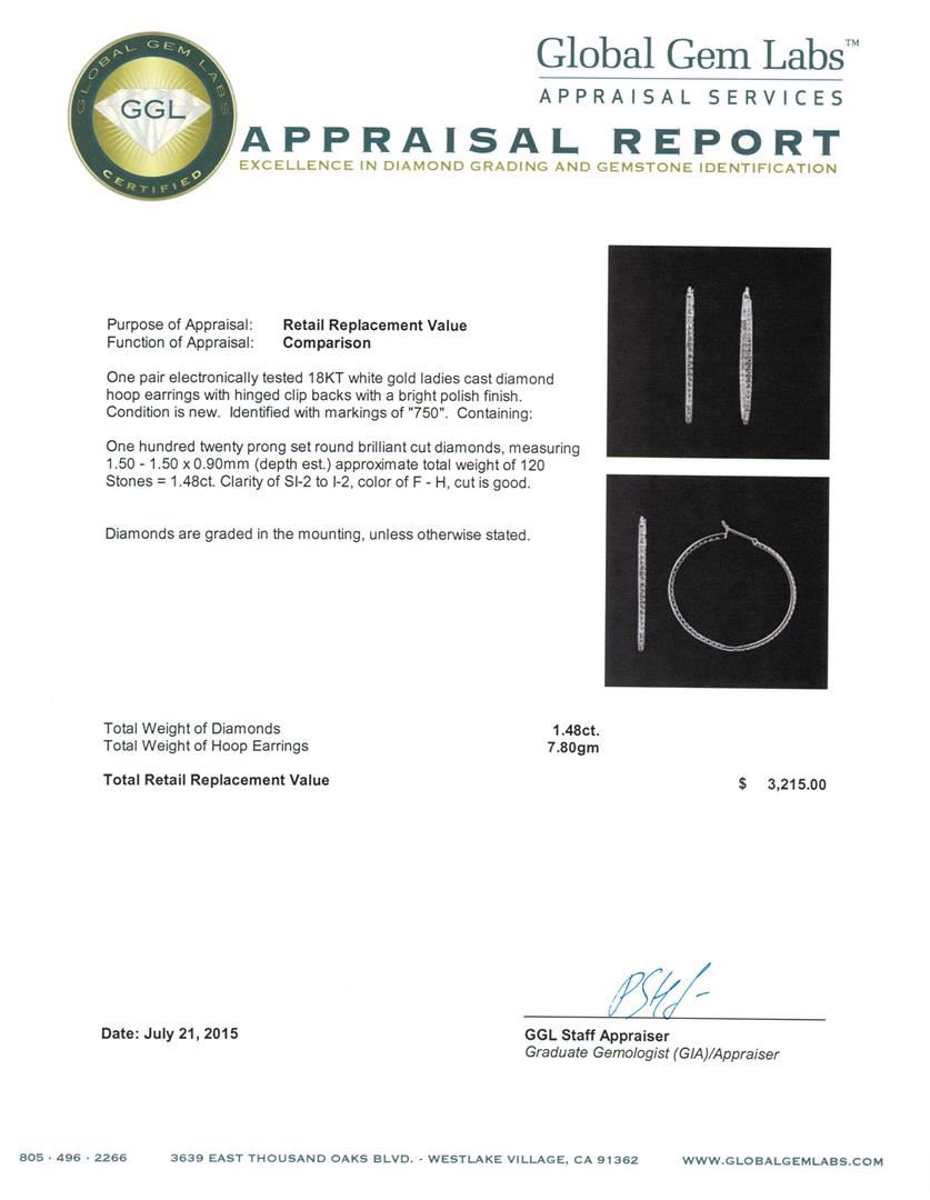 One pair electronically tested 18KT white gold ladies cast diamond hoop earrings with hinged clip backs with a bright polish finish. Identified with markings of "750". Condition is new. Containing: One Hundred Twenty prong set round brilliant cut diamonds, measuring 1.50 - 1.50 x 0.90mm (depth est.) approximate total weight of 120 Stones = 1.48ct. Clarity: SI-2 to I-2. Color: F - H, Cut is Good. Diamonds are graded in the mounting, unless otherwise stated. Total Weight of Diamonds 1.48ct. Total Weight of Hoop Earrings 7.80gm. GGL Appraised at $3,215.00.