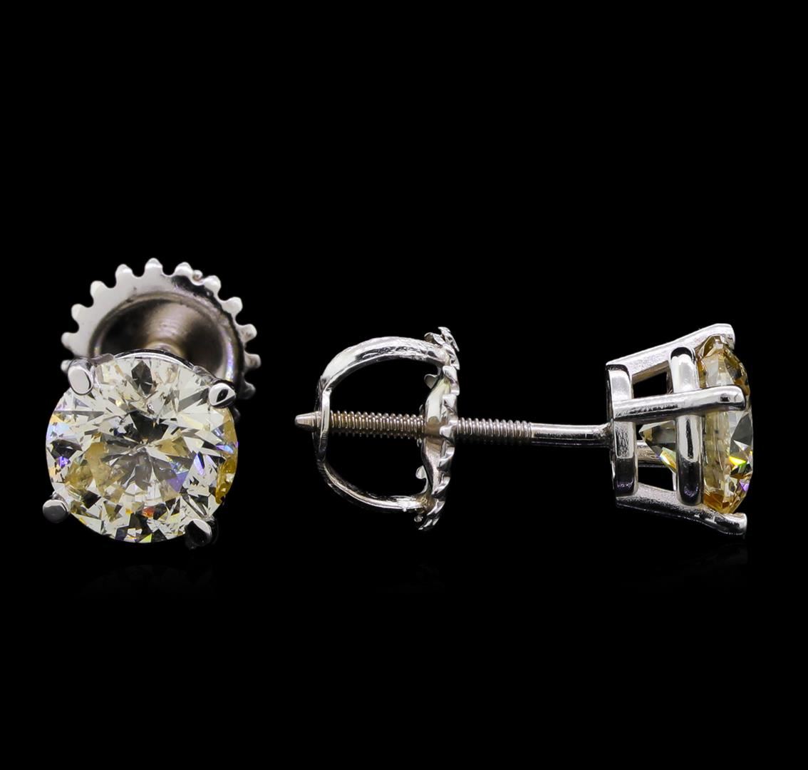 One pair electronically tested 14KT white gold cast & assembled diamond solitaire earrings with screw backs. Bright polish finish. Condition is new, good workmanship. Containing: One prong set round brilliant cut diamond, measuring 5.81 - 5.80 x 3.60mm (depth est.) approximate weight of 0.78ct. Naturally occurring internal & external characteristics are present, including yellow patches of color. Graded in the setting. Clarity: I-2. Color: 62.0%. Table 56.8%. One prong set round brilliant cut diamond, measuring 5.72 - 5.70 x 3.35mm (depth est.) approximate weight of 0.71ct. Naturally occurring internal & external characteristics are present, including brown and yellow patches of color. Graded in the setting. Clarity: I-2. Color: 58.7%. Table 61.3%. Total Weight of Diamonds 1.49ct. Total Weight of Earrings 1.24gm. AIG Appraised at $4,650.00.